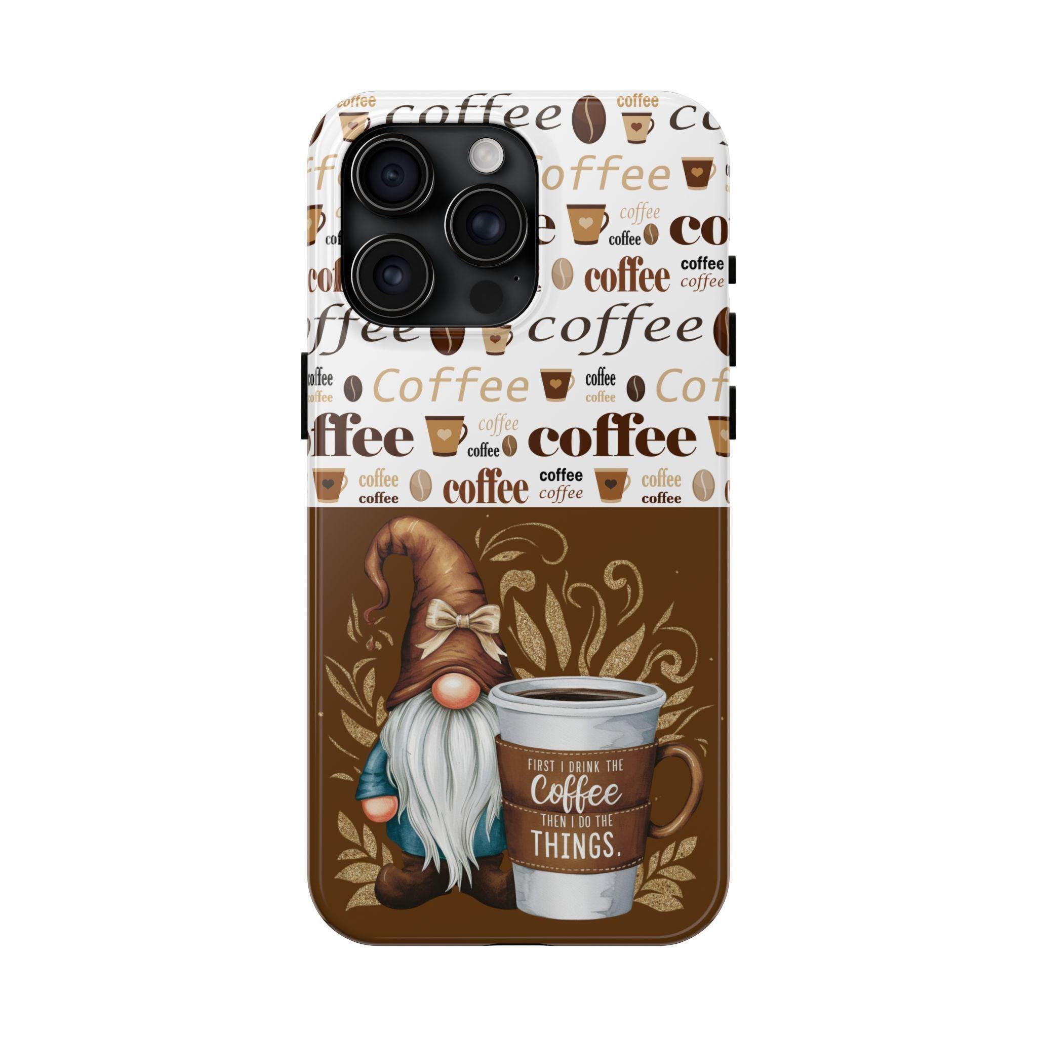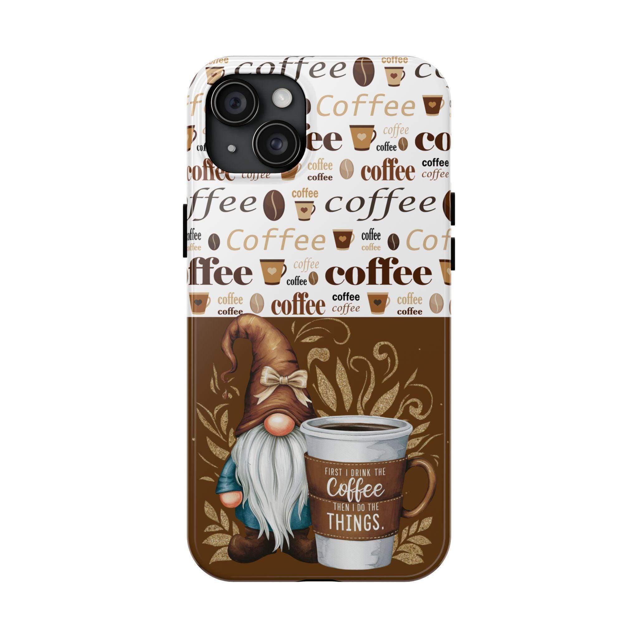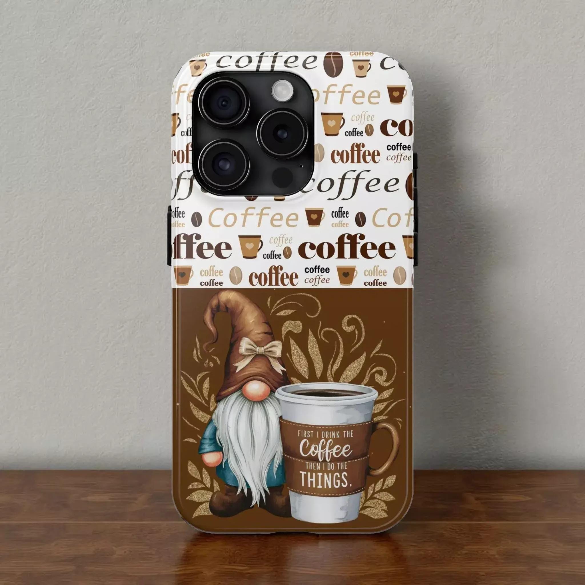 features a fun gnome holding a coffee cup, making it a delightful accessory for
