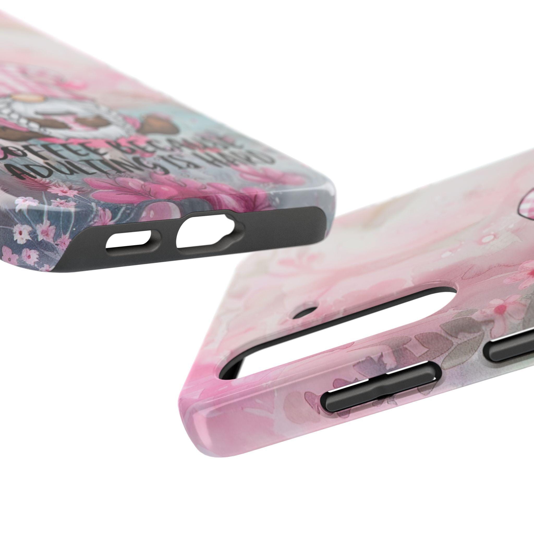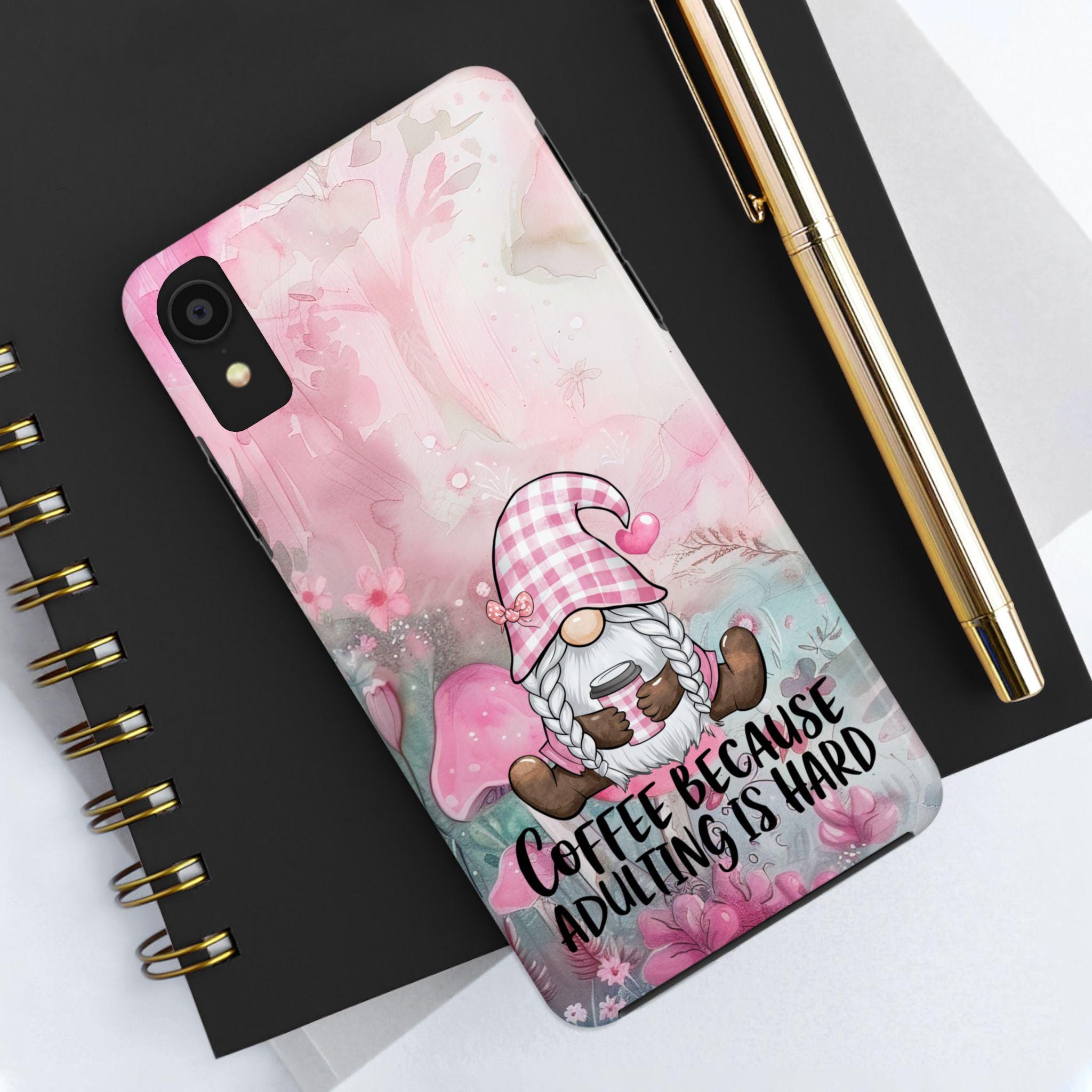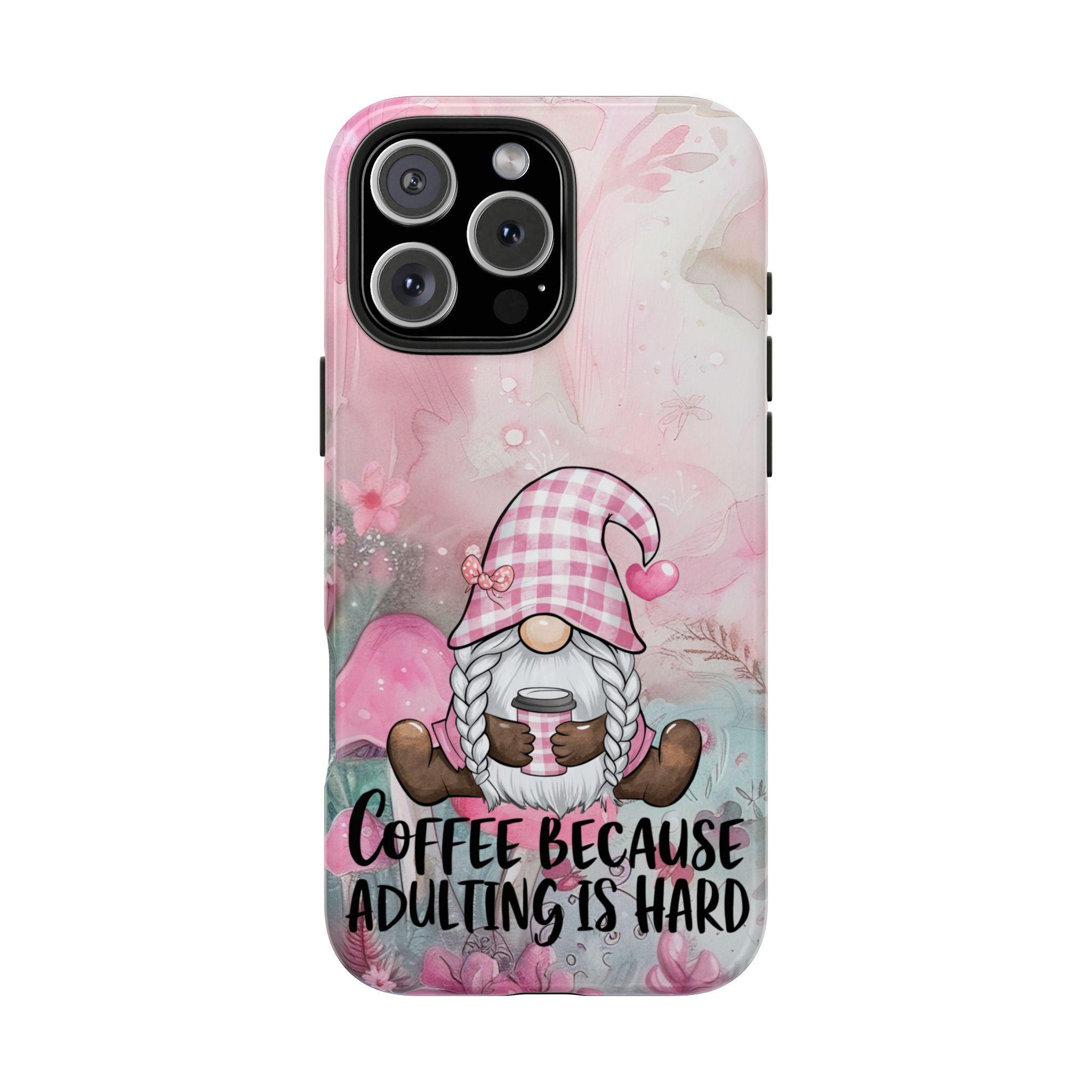 gnome, accompanied by the charming quote, "Coffee Because Adulting is Hard,"