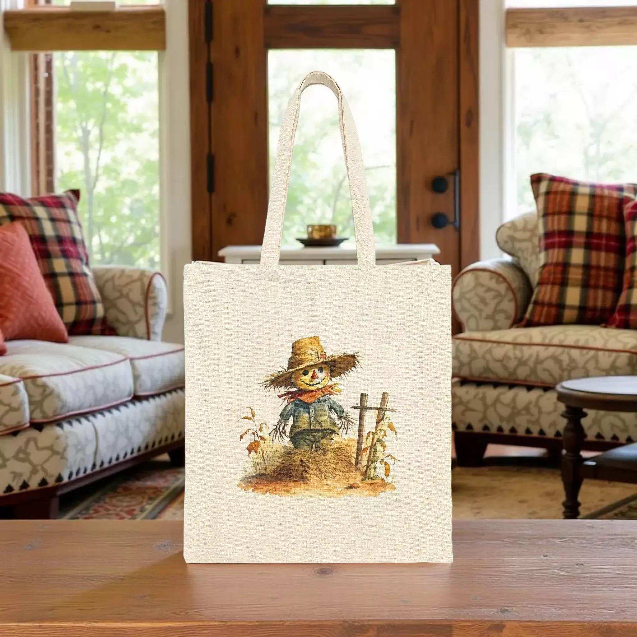 This Scarecrow Cotton Canvas Tote Bag exudes a cozy fall vibe, perfect for carrying groceries or books. Ideal for those who love autumn and Halloween celebrations.