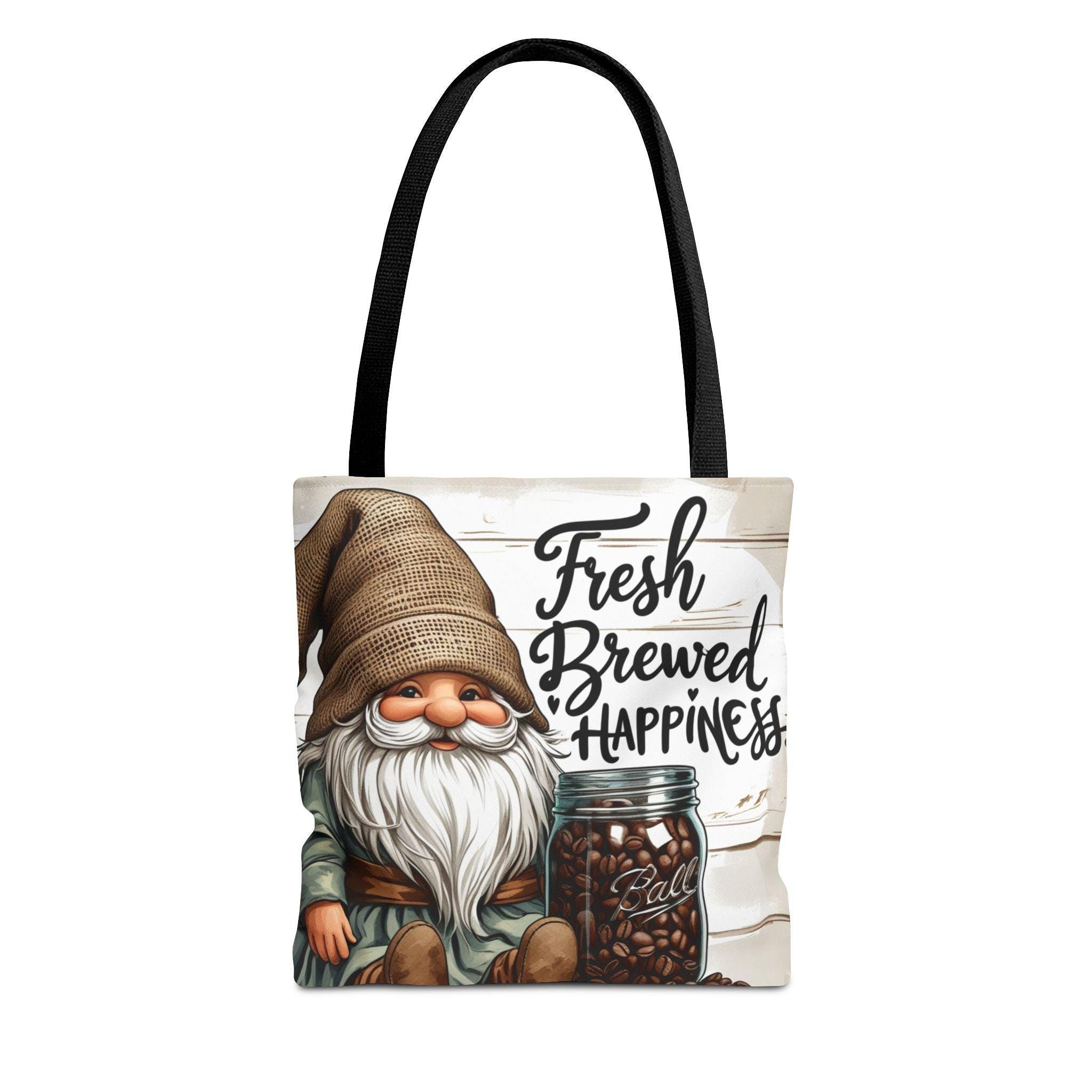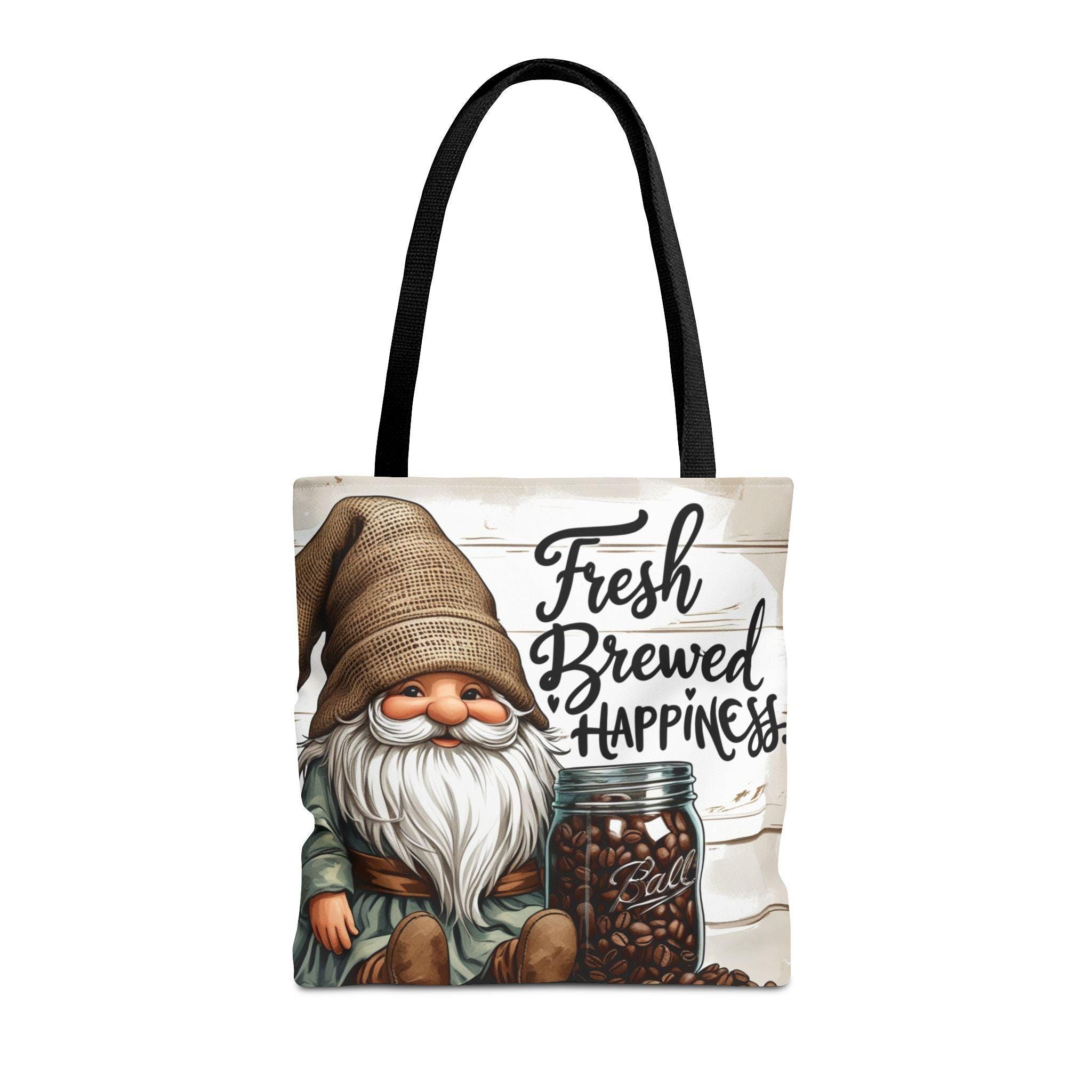 Introducing a delightful Tote Bag that perfectly captures the spirit of joy and warmth. Adorned with a whimsical design featuring a cheerful gnome and the phrase "Fresh Brewed Happiness," this tote is more than just a bag—it's a statement of joy. It's durable and versatile, ideal for everyday errands, farmers' markets, or casual outings. Perfect for coffee lovers, gnome enthusiasts, or anyone who appreciates a dash of fun in their daily routine. A great gift for holidays, celebrations, or to simply brighten someone's day! Bring a sense of cheer anywhere you go with this charming tote, making it a must-have for your collection.