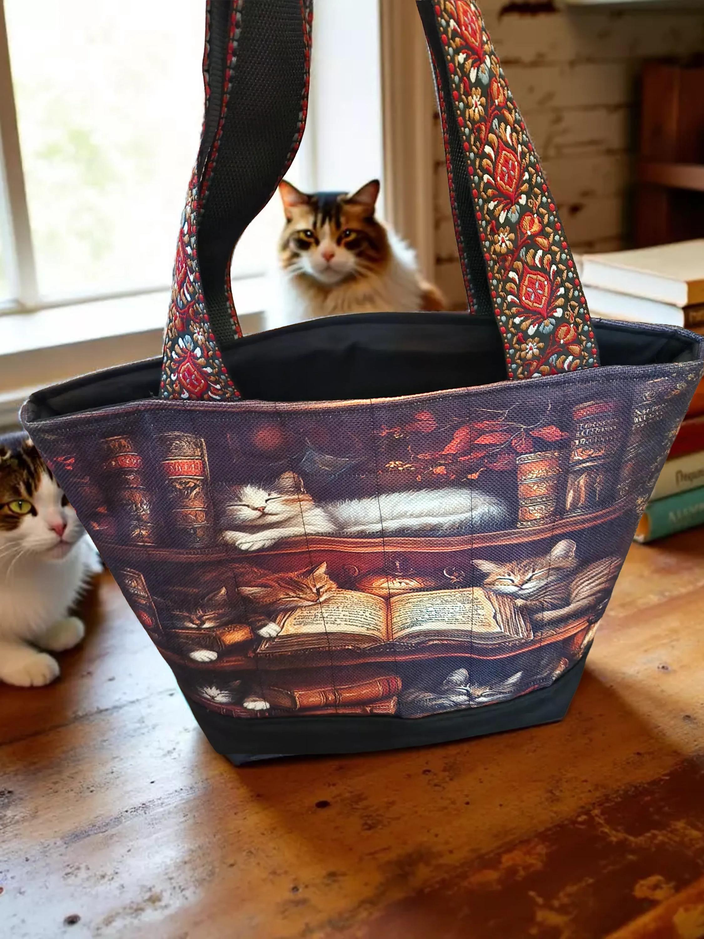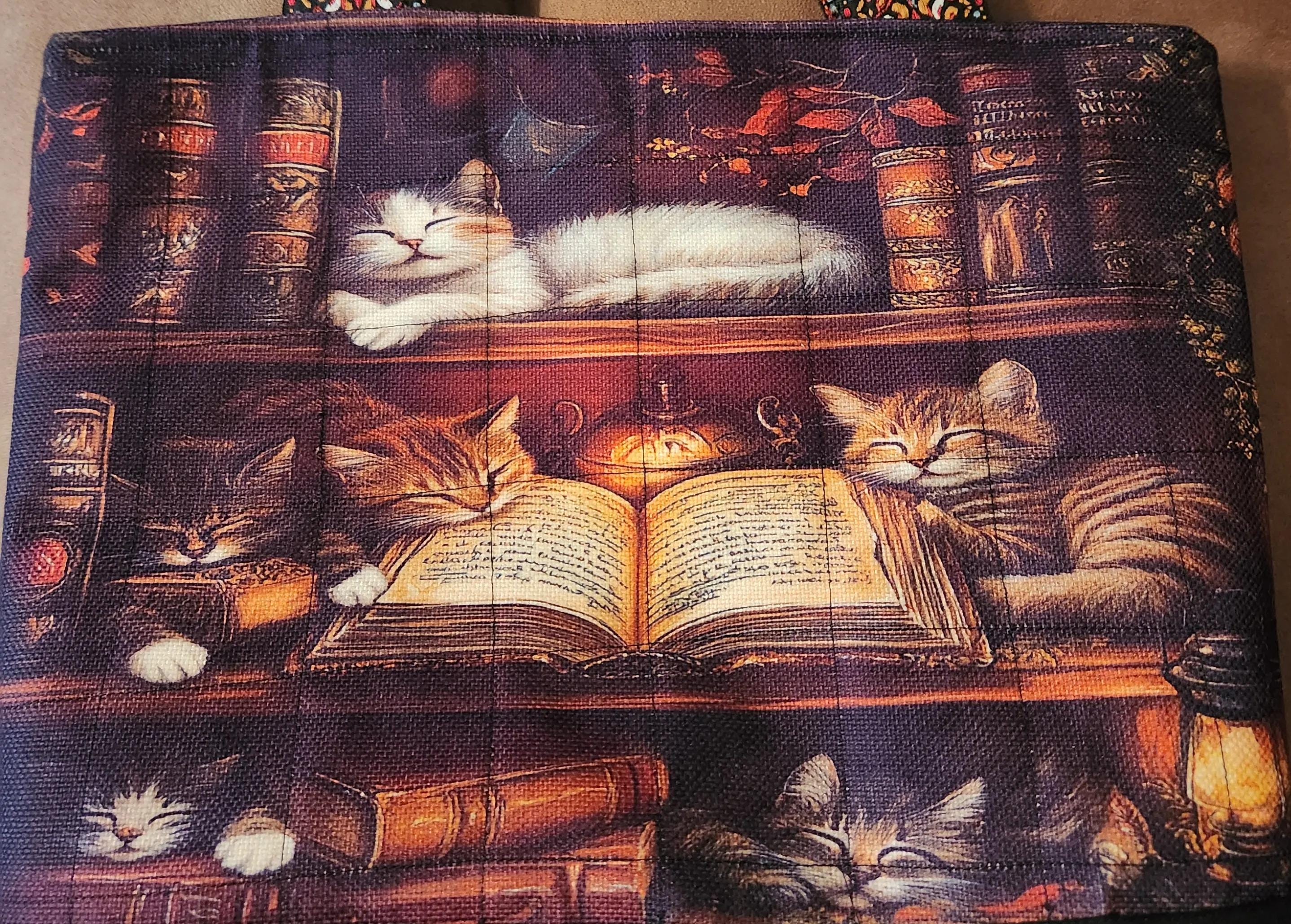 Discover the charm of our quilted tote, designed for lovers of cats, books, and sustainable style. Crafted from durable cotton canvas featuring delightful cat and book motifs, this large carryall is perfect for shopping trips or carrying your favorite reads. With thoughtful quilting and double-stitched handles, it combines practicality with cozy, whimsical appeal.