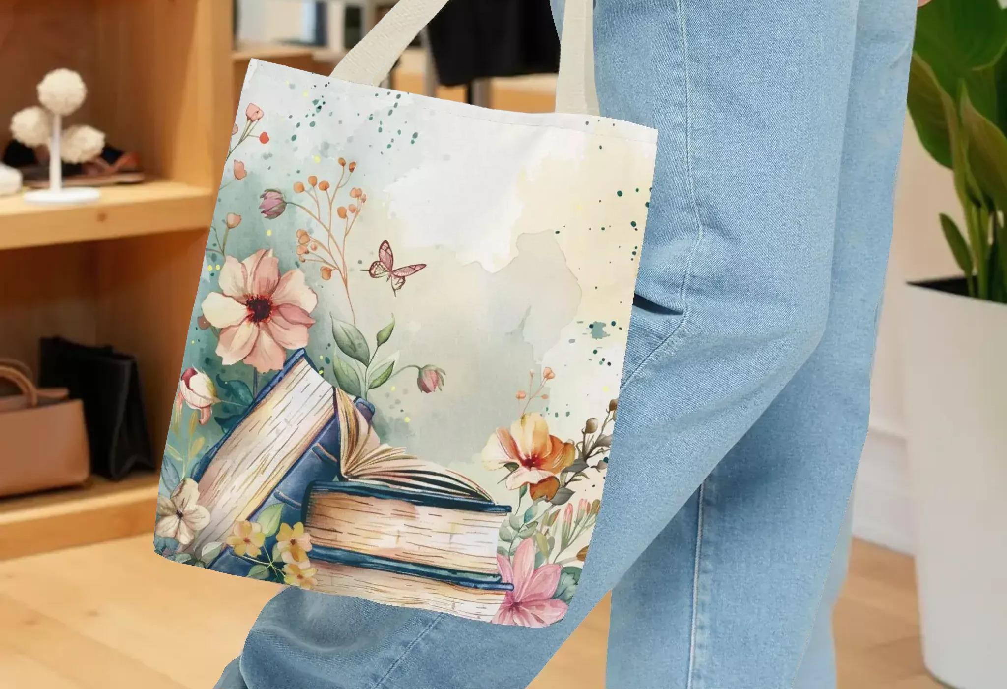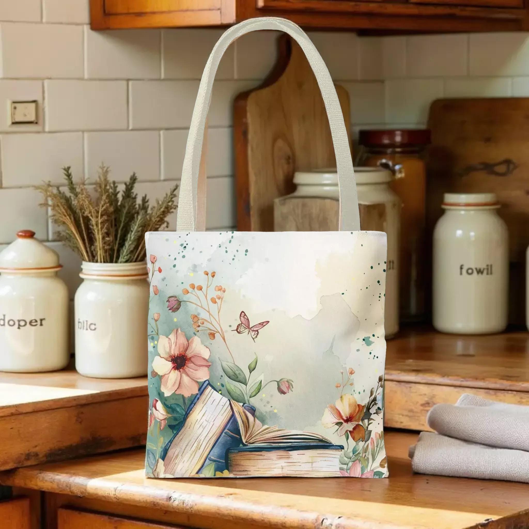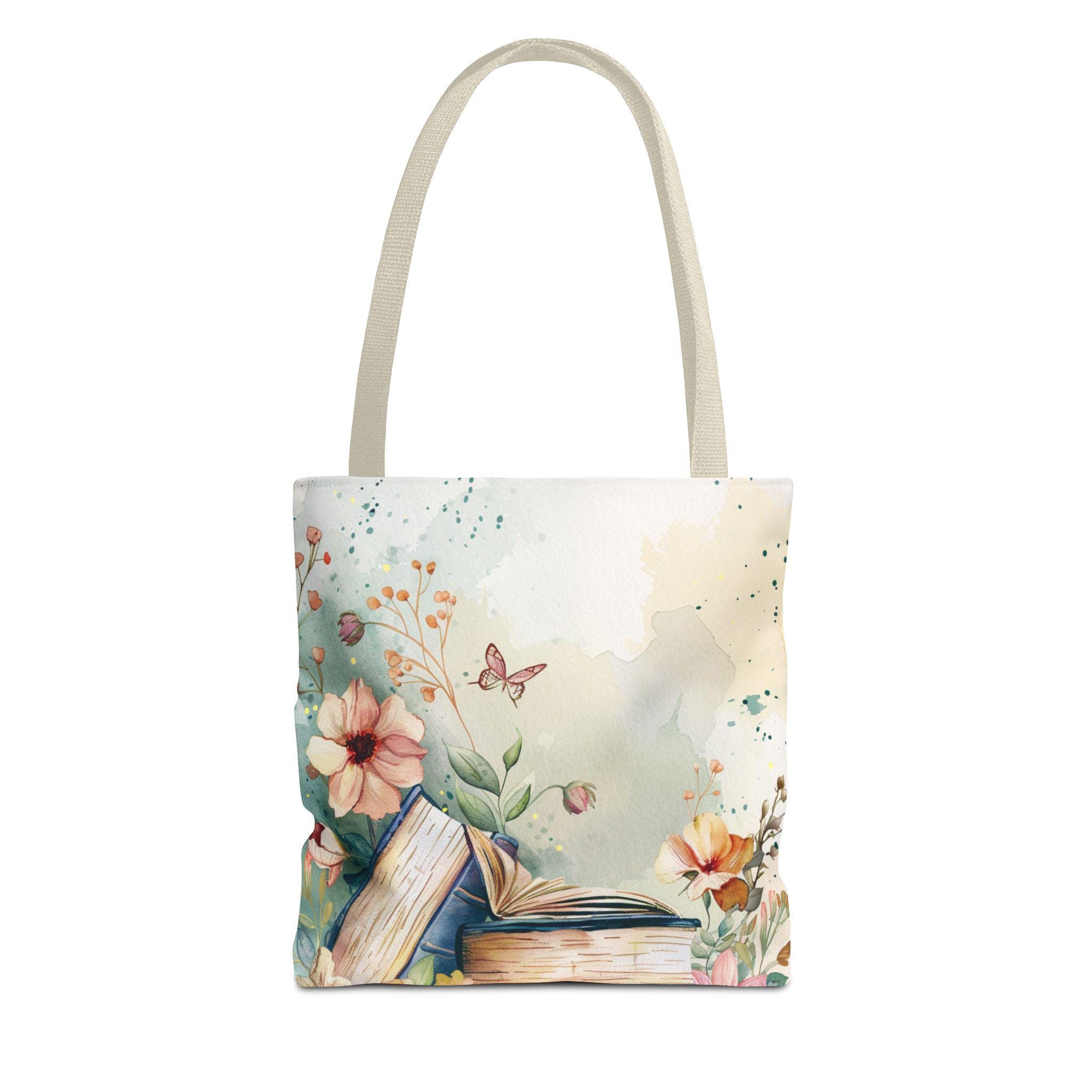 Embrace the charm of a floral booklover tote bag that beautifully blends watercolor blooms with an open book motif, creating a quietly romantic accessory perfect for any day. This artful tote, featuring delicate butterflies and subtle splashes of teal and warm cream, invites you to carry your essentials in style while celebrating your love for stories and nature. Designed with practicality in mind, this tote balances aesthetic appeal with roomy functionality, making it ideal for books, market finds, or daily essentials.