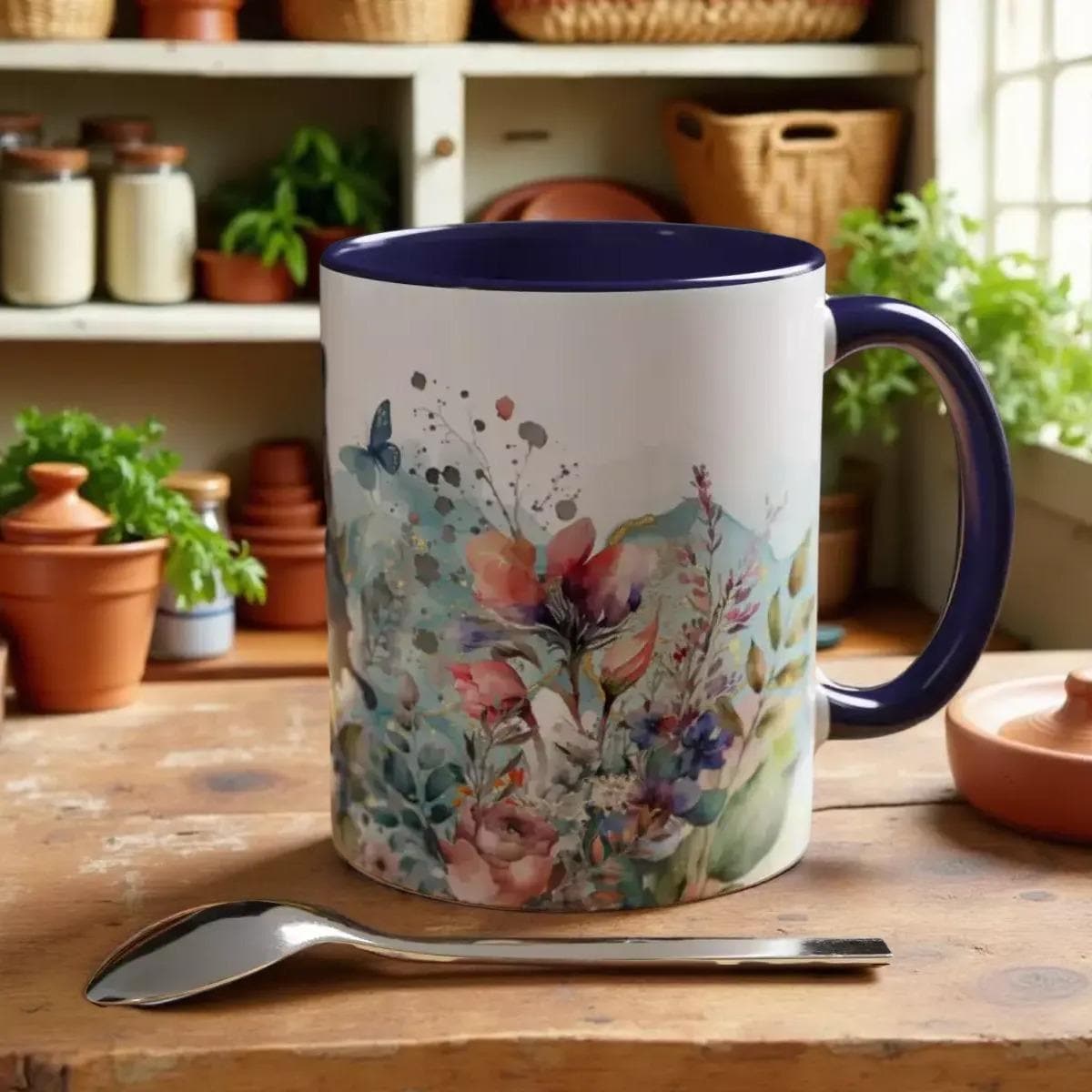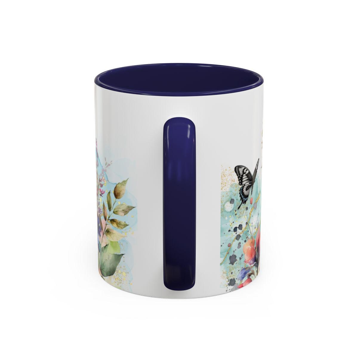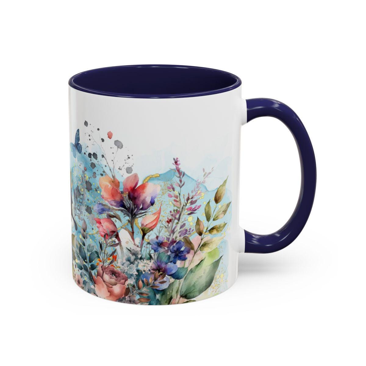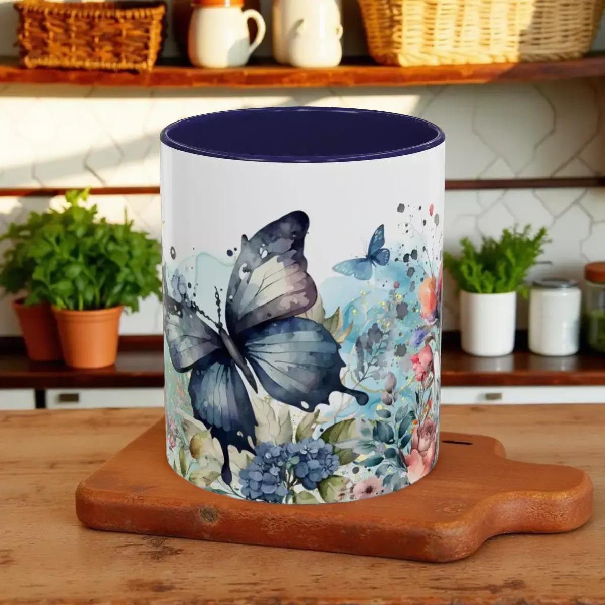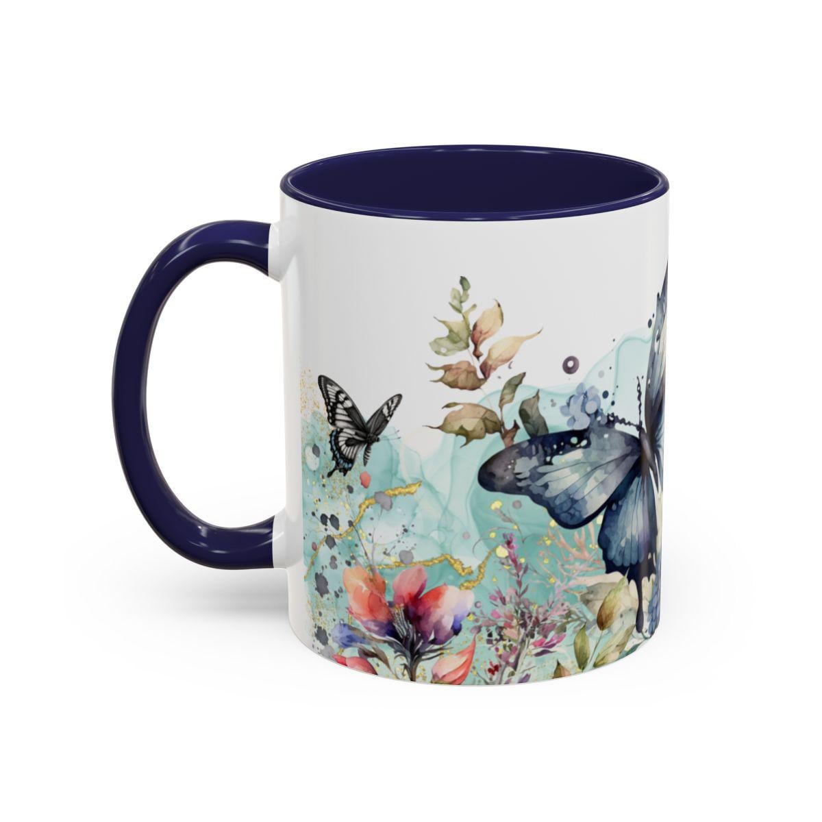 Experience the charm of nature with this floral butterfly navy blue accent coffee mug, a perfect blend of artistry and function. Designed for lovers of unique kitchenware, this mug brings vibrant colors and delicate butterfly motifs to your daily coffee or tea ritual. Whether you're starting your morning or enjoying a cozy evening, this nature-inspired ceramic mug adds a touch of elegance and warmth to every sip.
