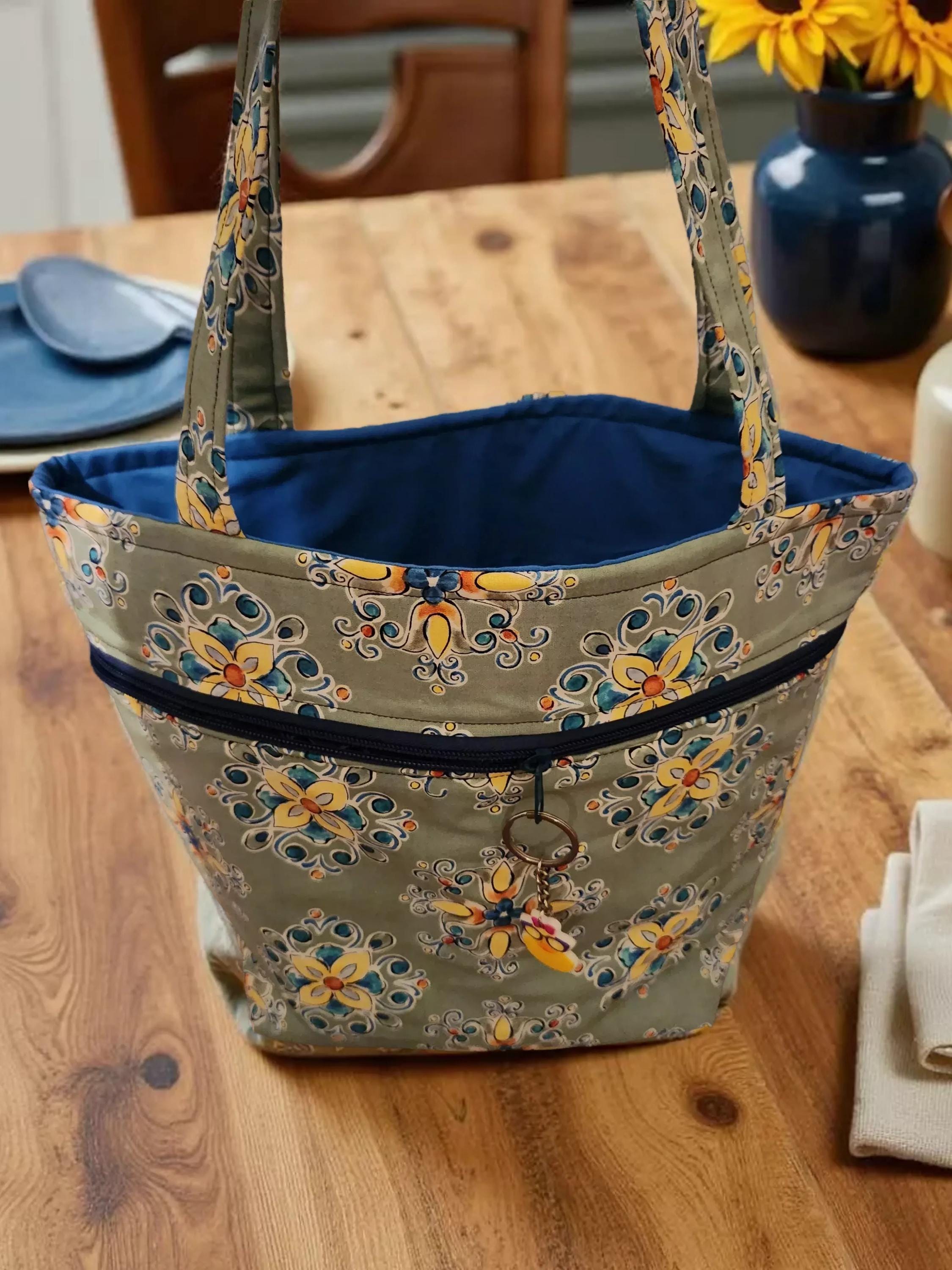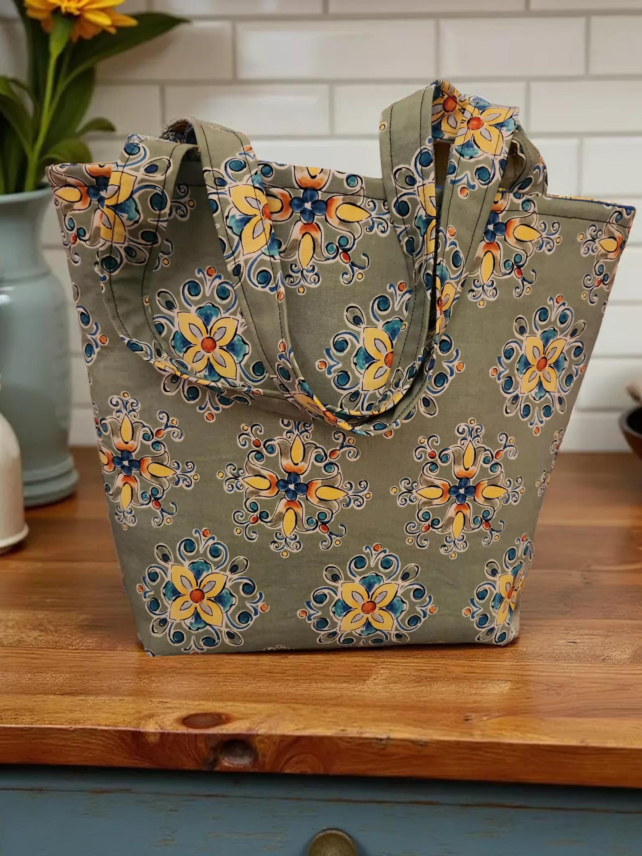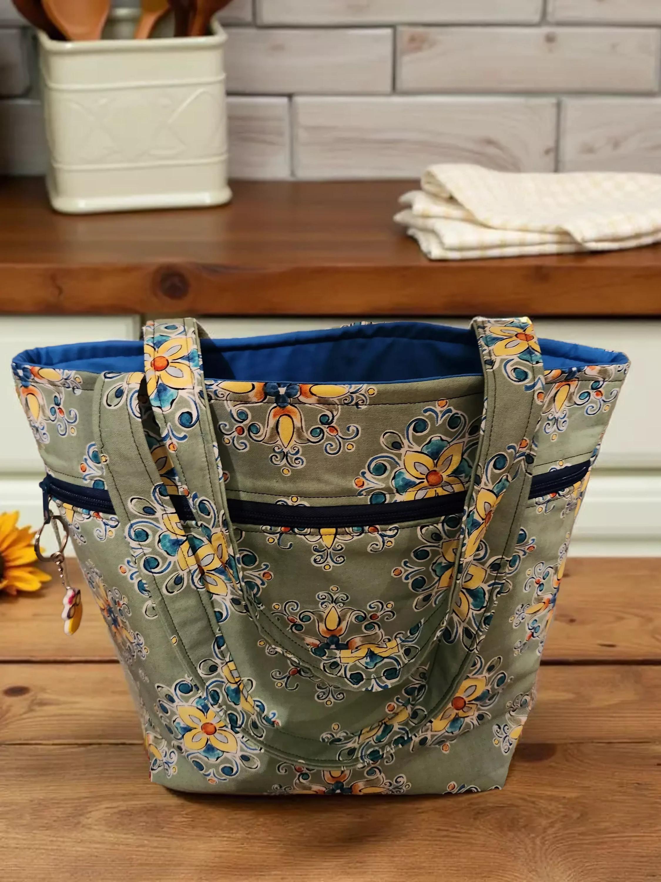 Discover the perfect blend of style and practicality with this vibrant tote bag, featuring green and blue hues accented by cheerful yellow flowers. Crafted from 100% cotton with a medium weight fusible fleece for durability, this shopping bag carryall is designed for everyday use. Whether you're heading to the market or running errands, its large front zipper pocket and double-stitched handles offer convenience and strength.