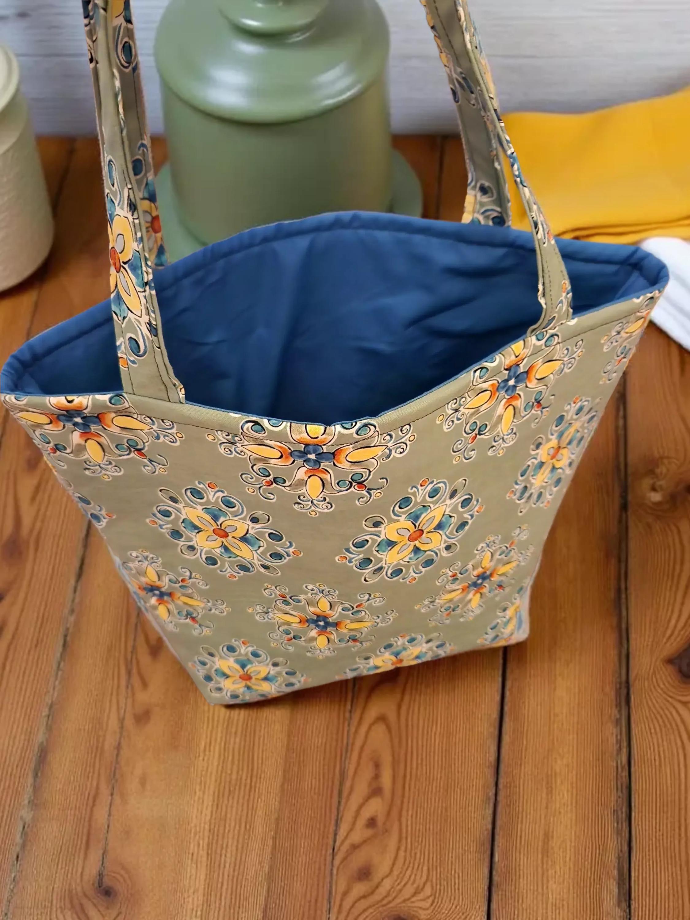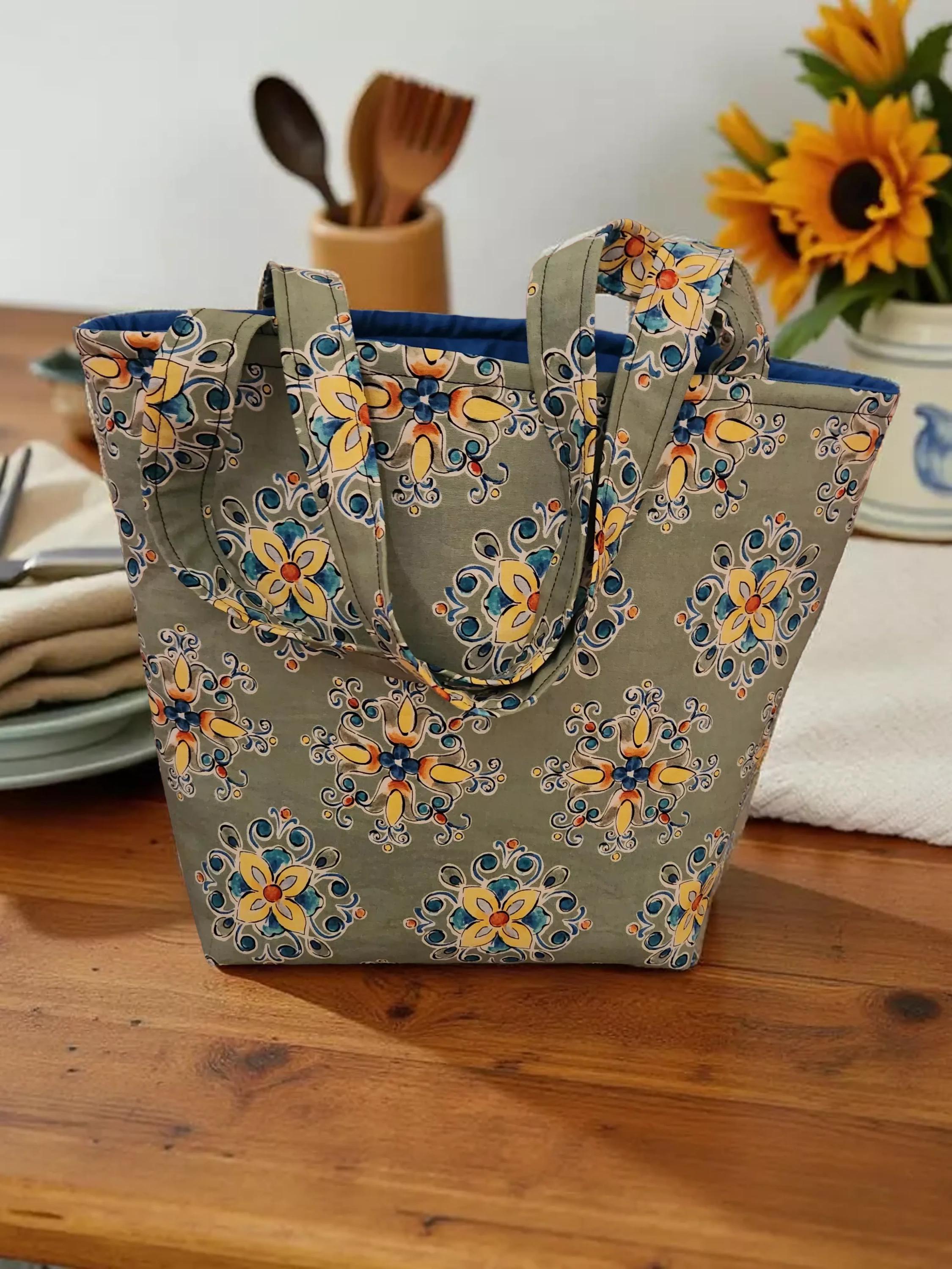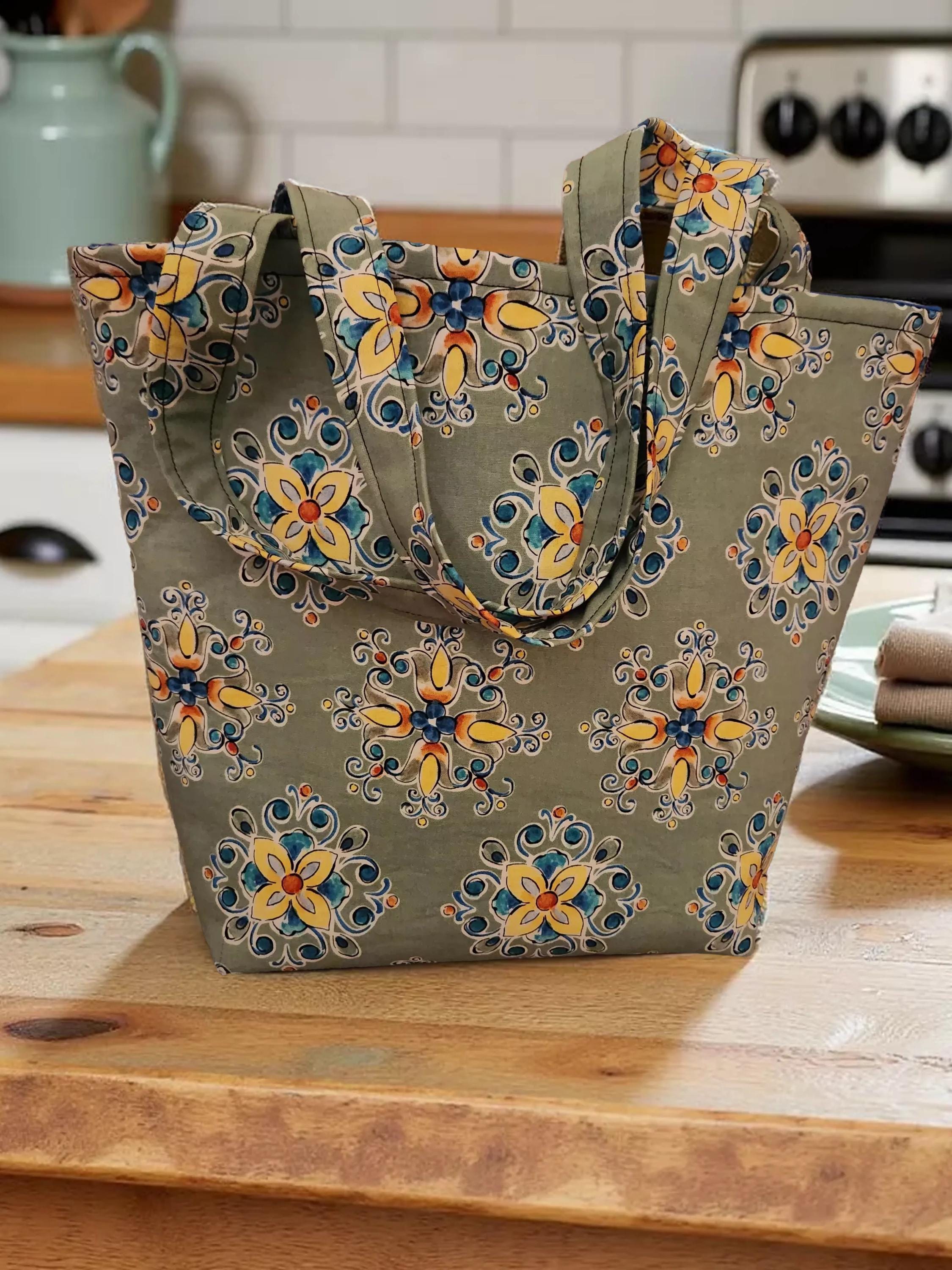 Discover the perfect blend of style and practicality with this vibrant tote bag, featuring green and blue hues accented by cheerful yellow flowers. Crafted from 100% cotton with a medium weight fusible fleece for durability, this shopping bag carryall is designed for everyday use. Whether you're heading to the market or running errands, its large front zipper pocket and double-stitched handles offer convenience and strength.