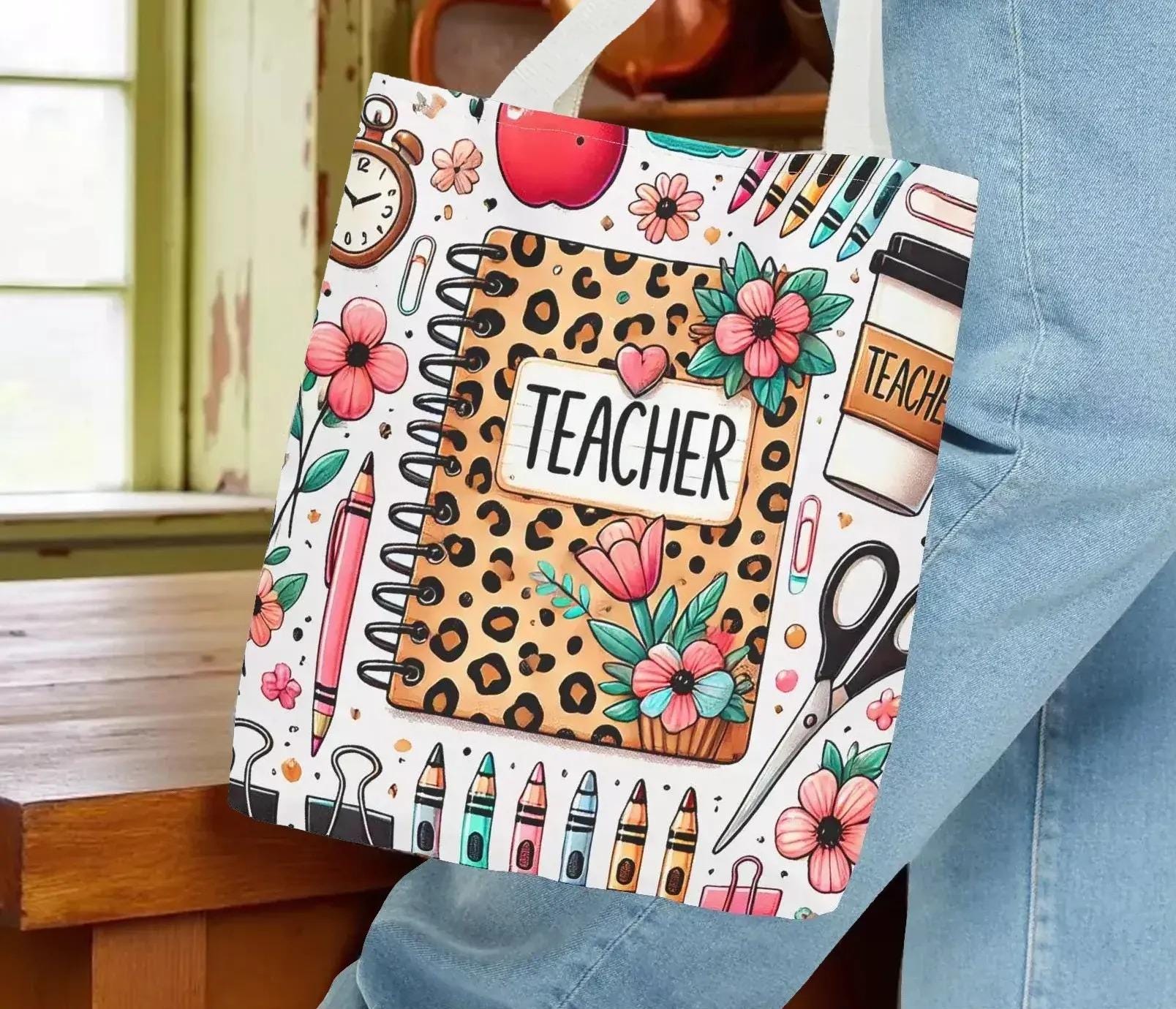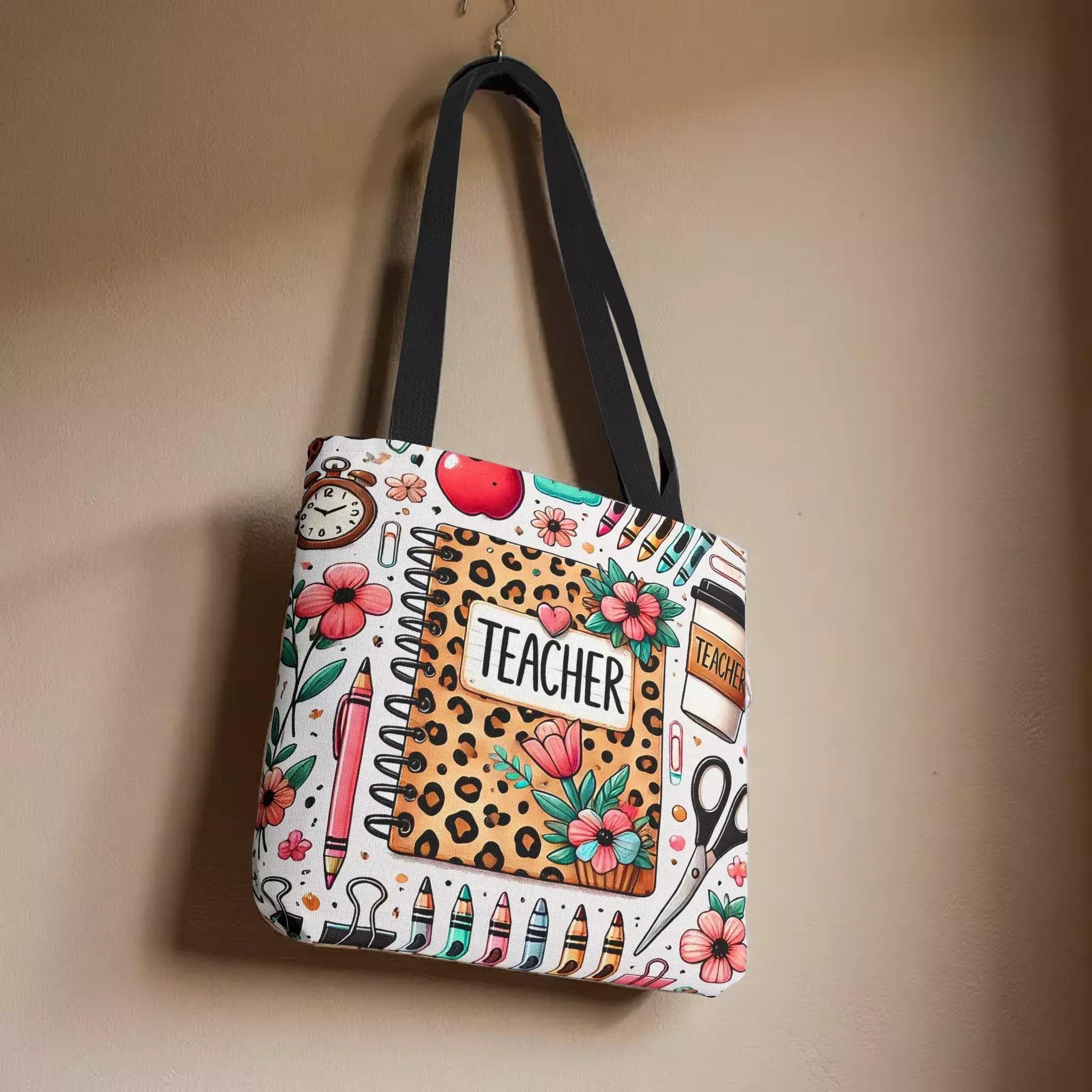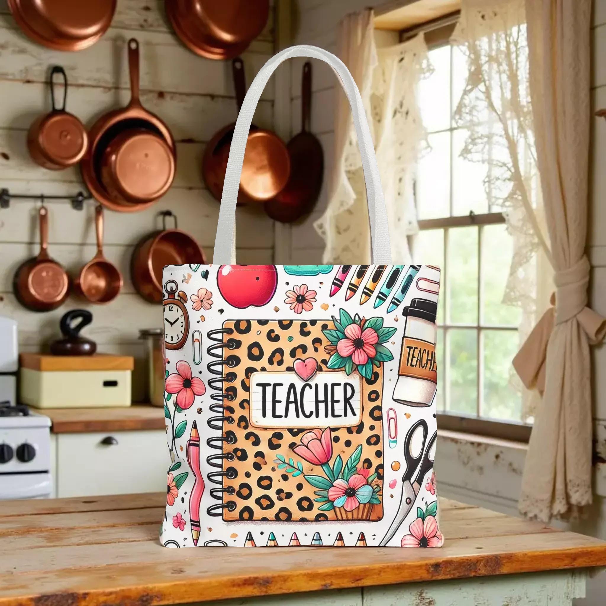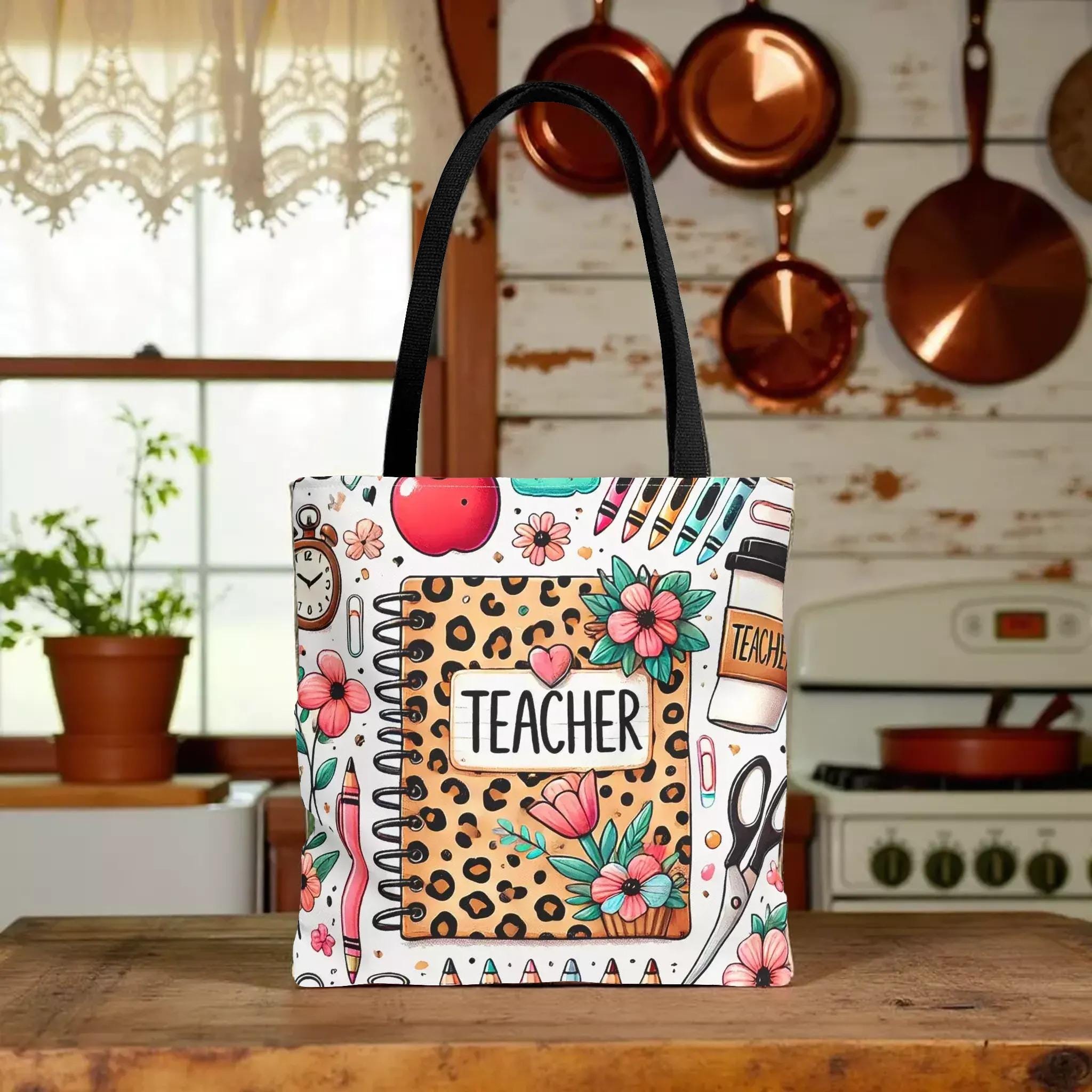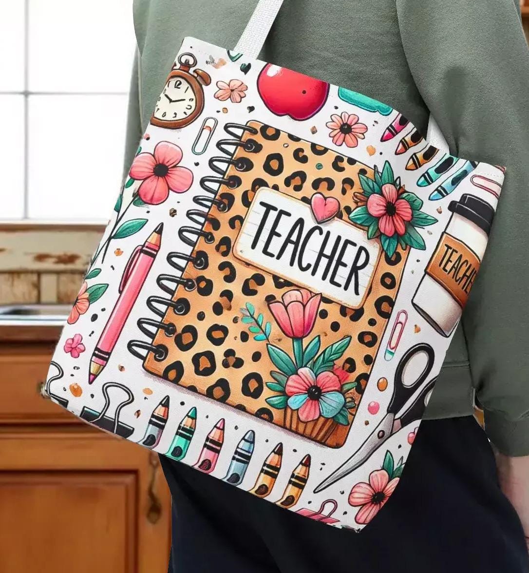 Discover a tote that perfectly blends style and function, designed especially for teachers who appreciate both practicality and charm. This durable teacher tote features a playful leopard print notebook motif surrounded by soft florals and school-day icons, making it a cheerful companion for every school day. Its roomy interior and sturdy construction make it an ideal book bag for carrying everything from lesson plans to laptops with ease.
