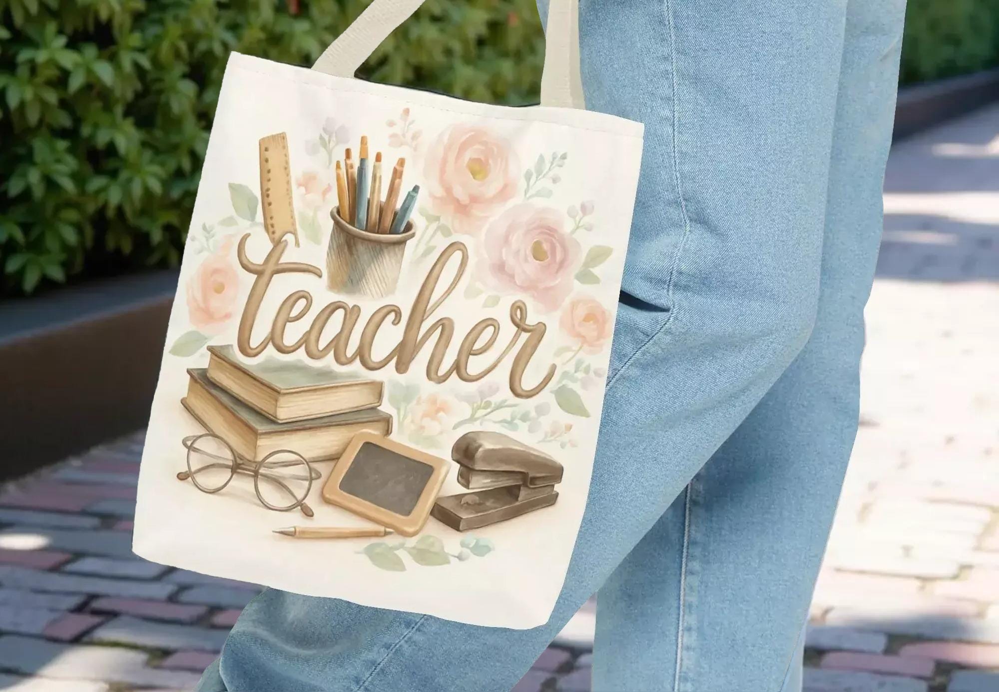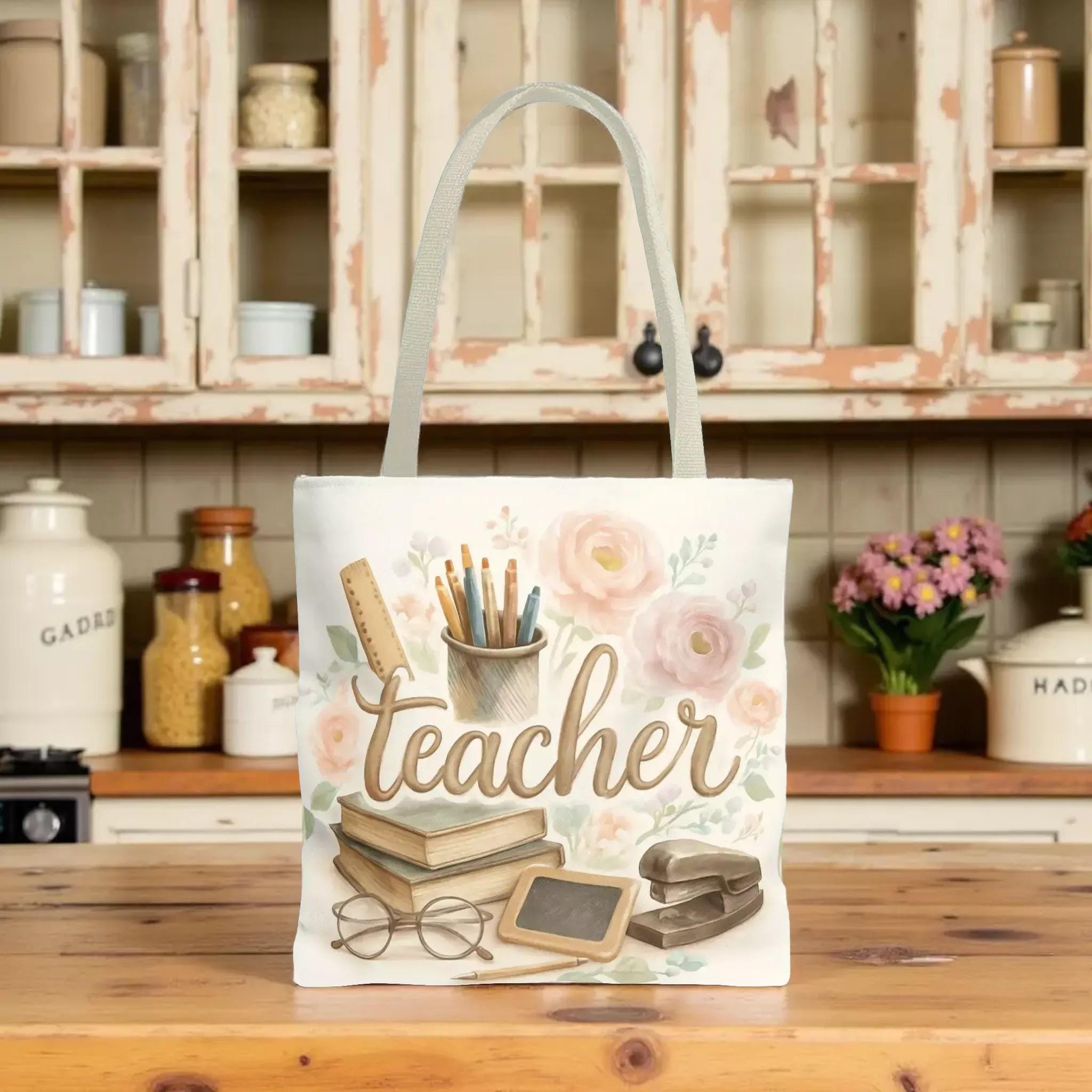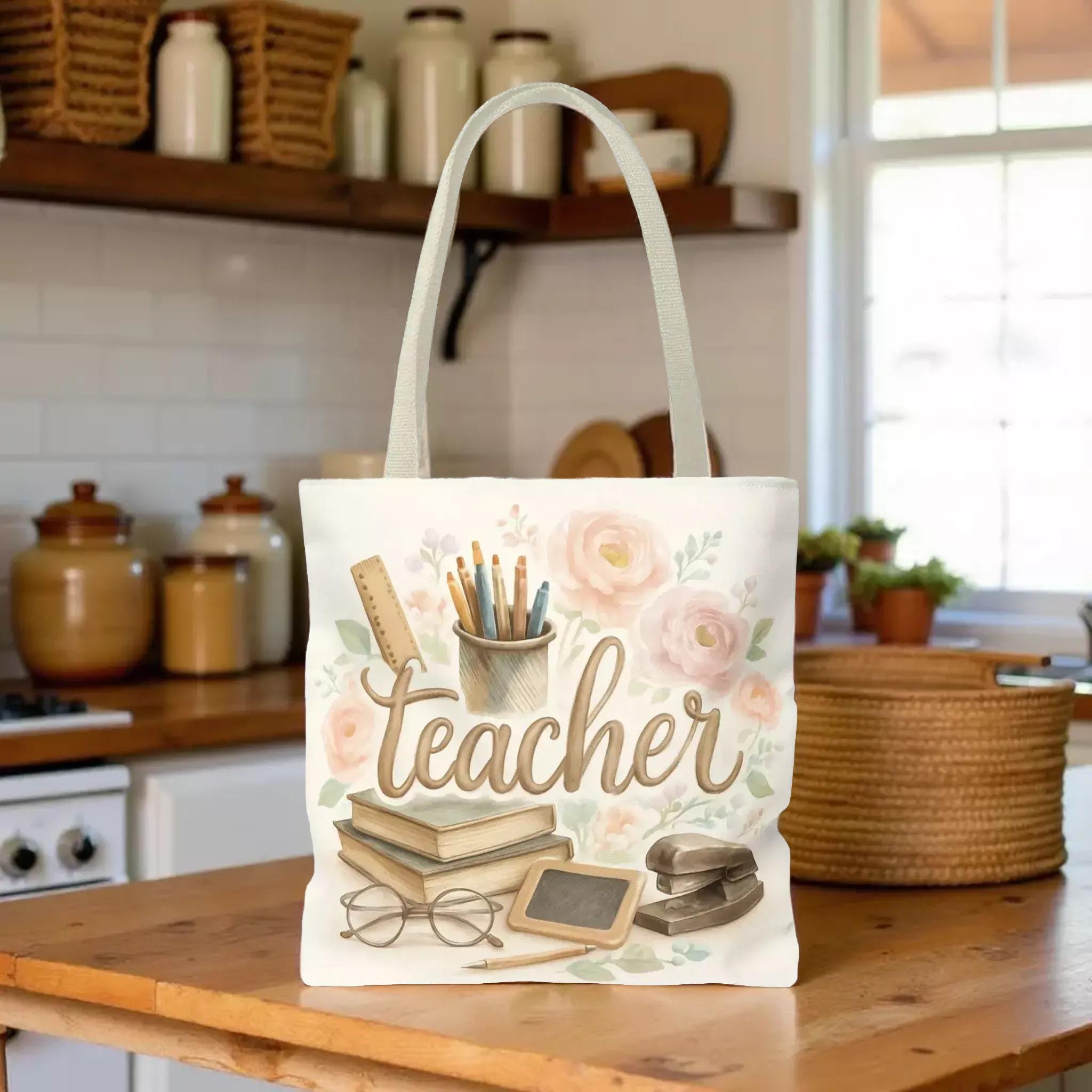 For the dedicated educator who treasures both style and function, this floral teacher tote book bag blends soft watercolor blooms with a charming pencil design to inspire every school day. Crafted with durable polyester and reinforced handles, this roomy tote holds lesson plans, planners, and all the essentials needed between classrooms and conferences. The warm, hand-lettered "teacher" script adds a personal touch that feels like a thoughtful note left on a desk.
