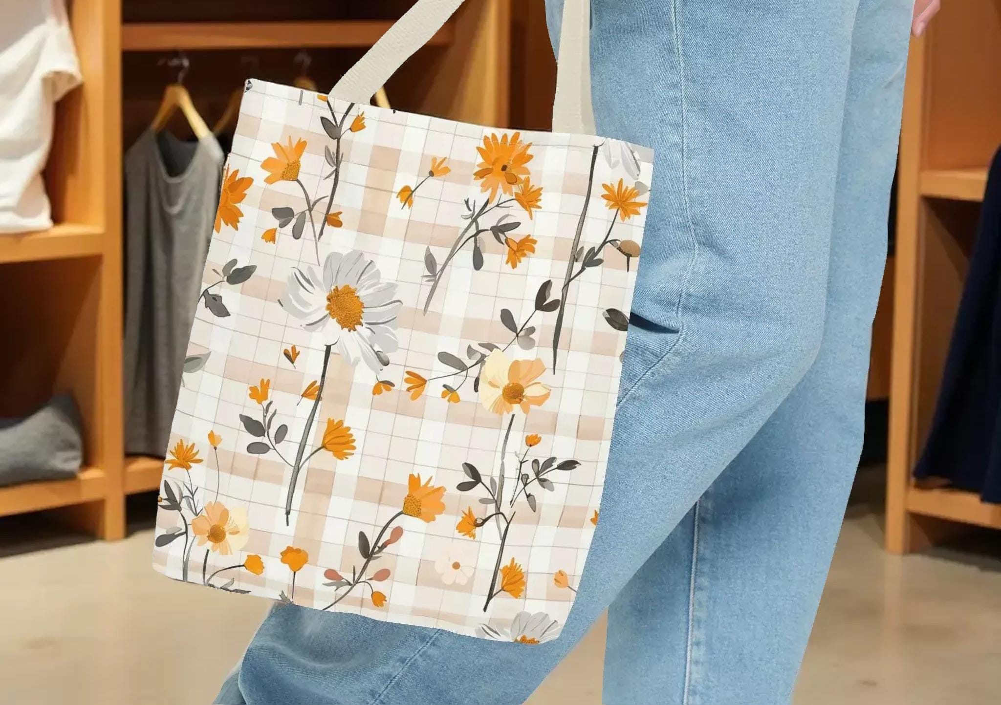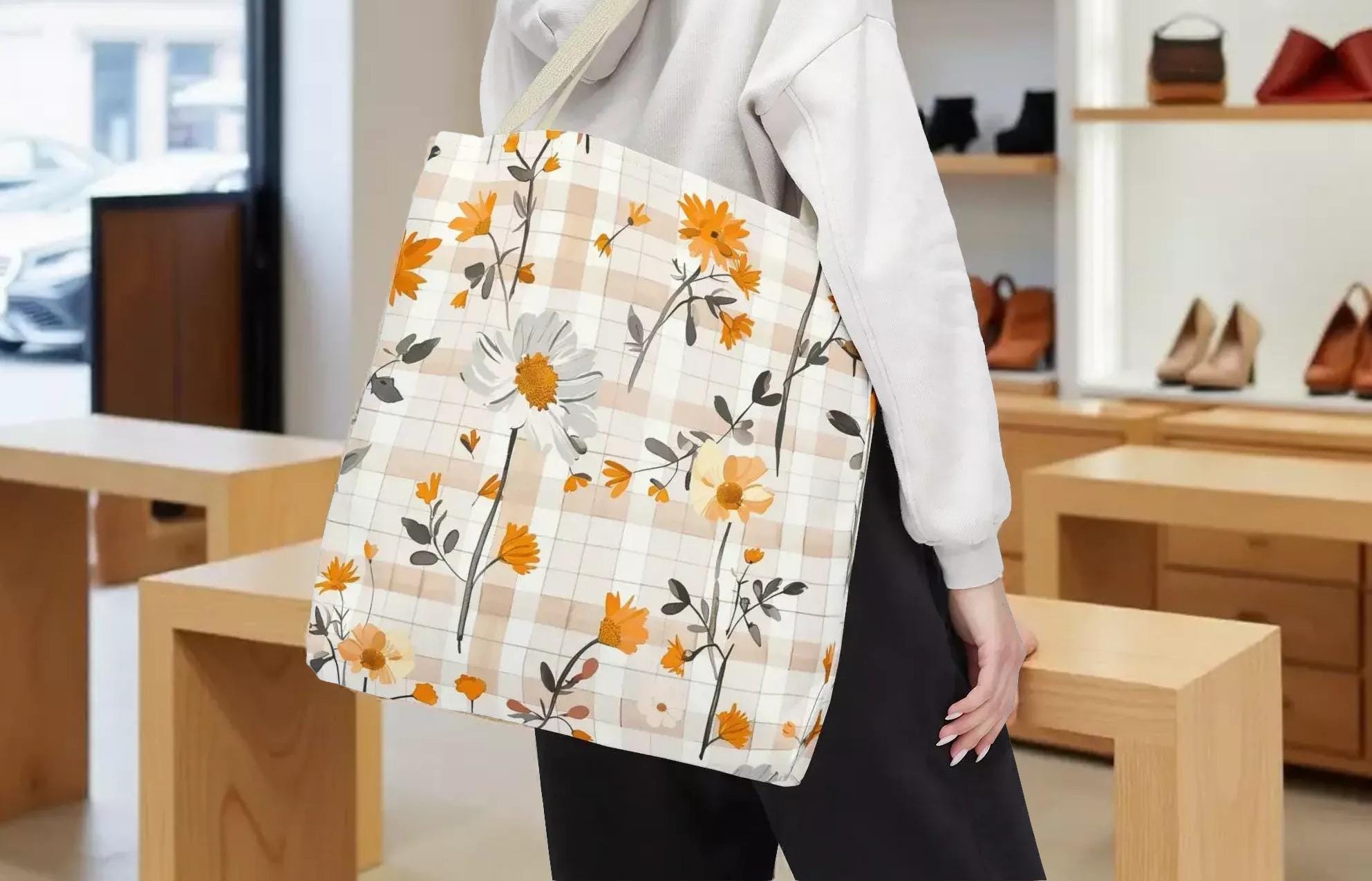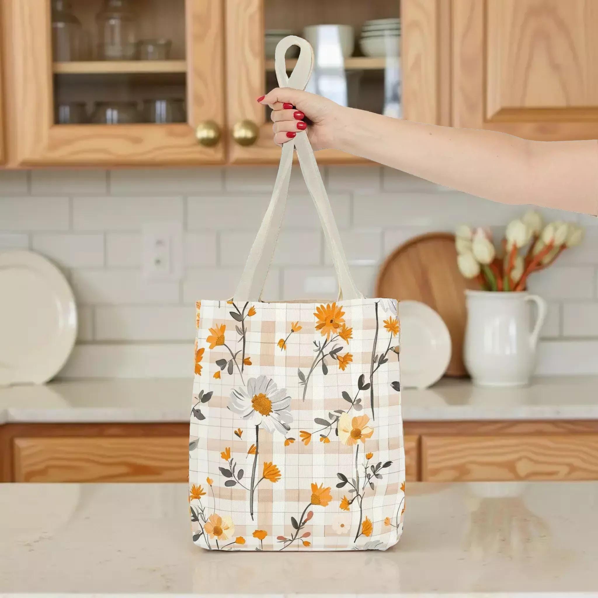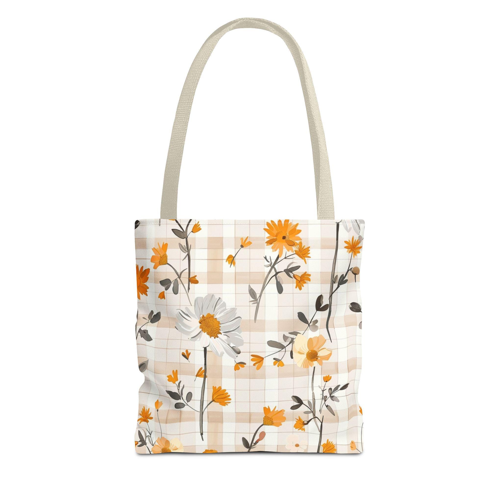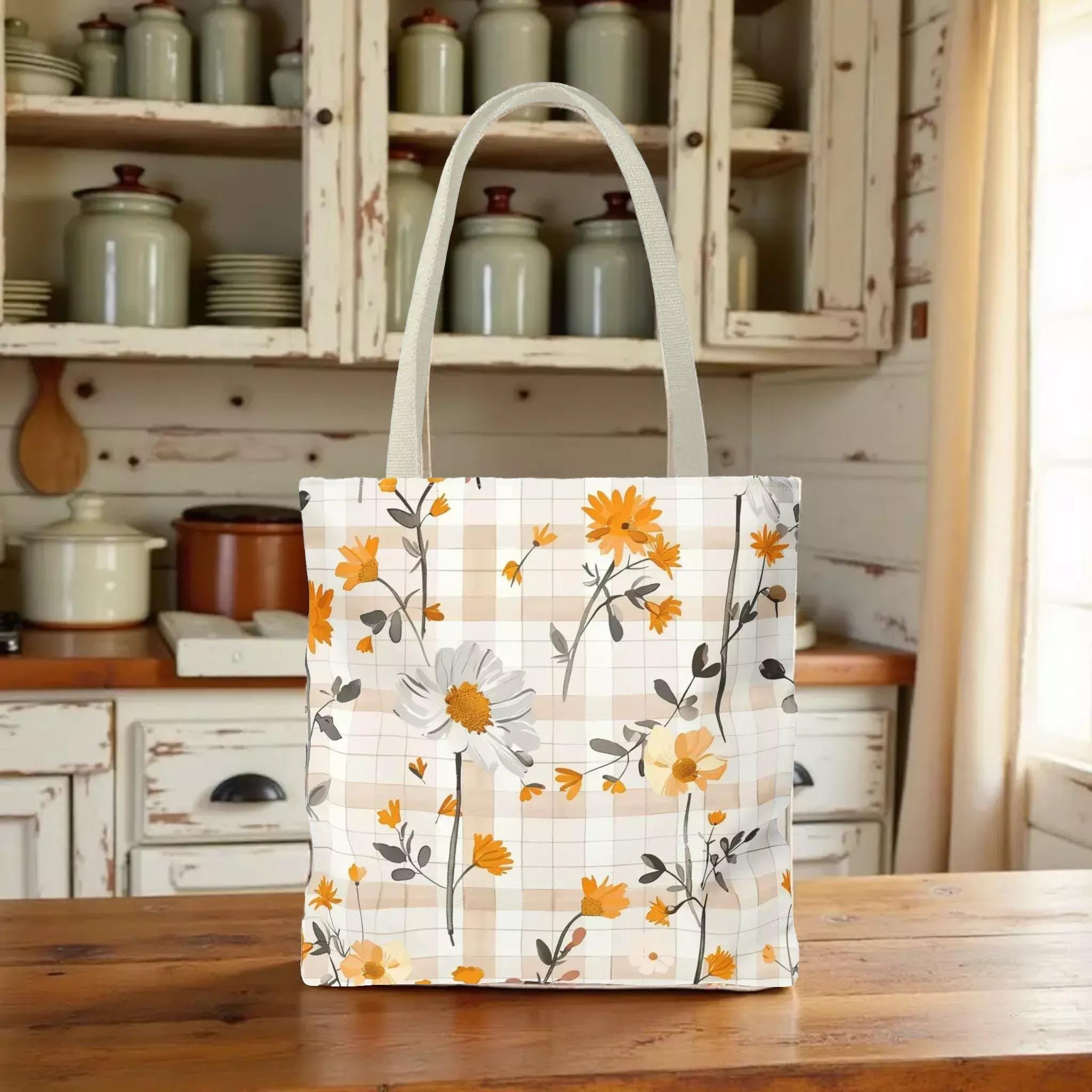 Embrace the charm of sunlit afternoons with this floral plaid tote bag, where yellow and white daisies bloom against a soft beige plaid background. Designed for those who cherish slow market strolls and vintage-inspired style, this tote combines cheerful hand-painted florals with practical durability. Crafted from quick-drying polyester with reinforced handles, it’s a reliable companion that fits effortlessly into your everyday rhythm.