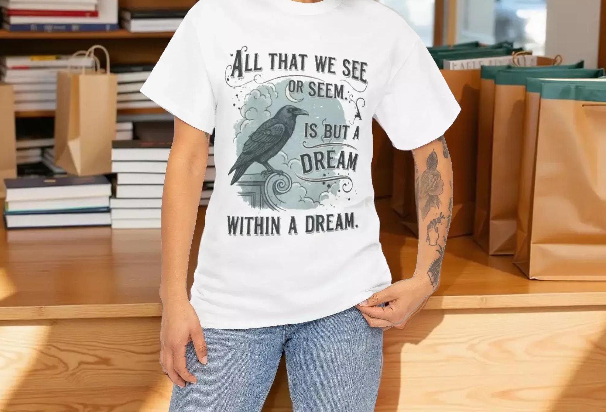 Step into a world of quiet reflection with this literary raven t-shirt, a perfect blend of vintage style and poetic charm. Inspired by the haunting line "All that we see or seem is but a dream within a dream," this tee features a hand-drawn raven surrounded by swirling clouds and roses, evoking a gothic, thoughtful mood. Crafted for lovers of classic unisex fashion and dream quote enthusiasts, it invites you to embrace a timeless story woven into every thread.
