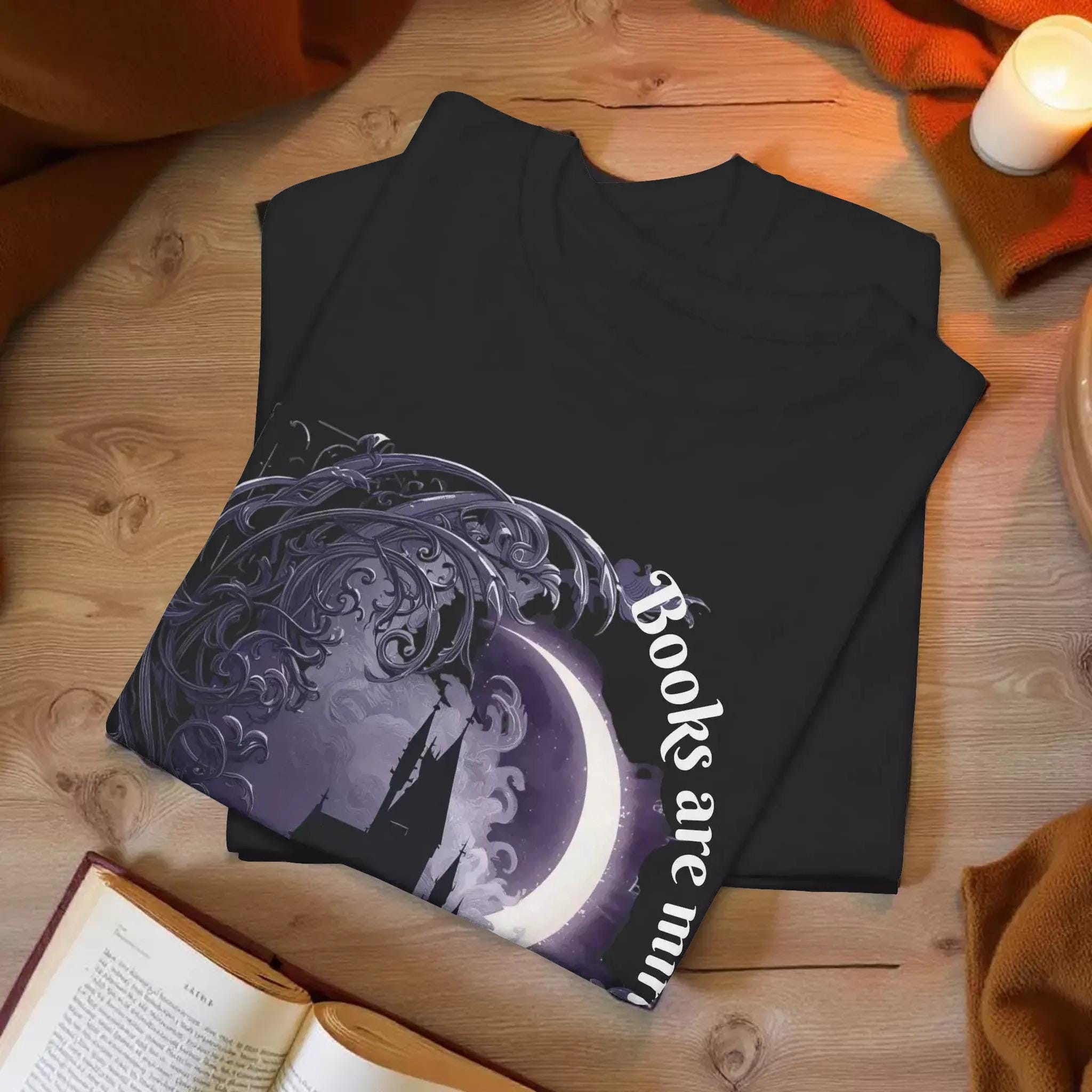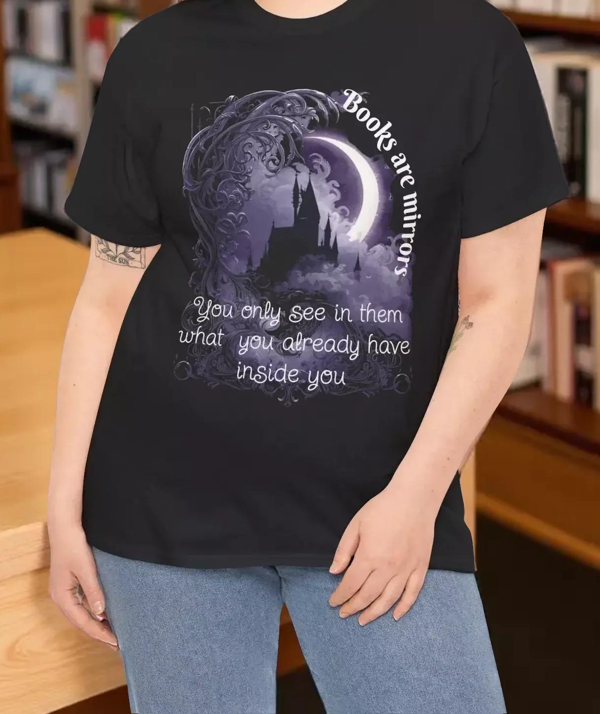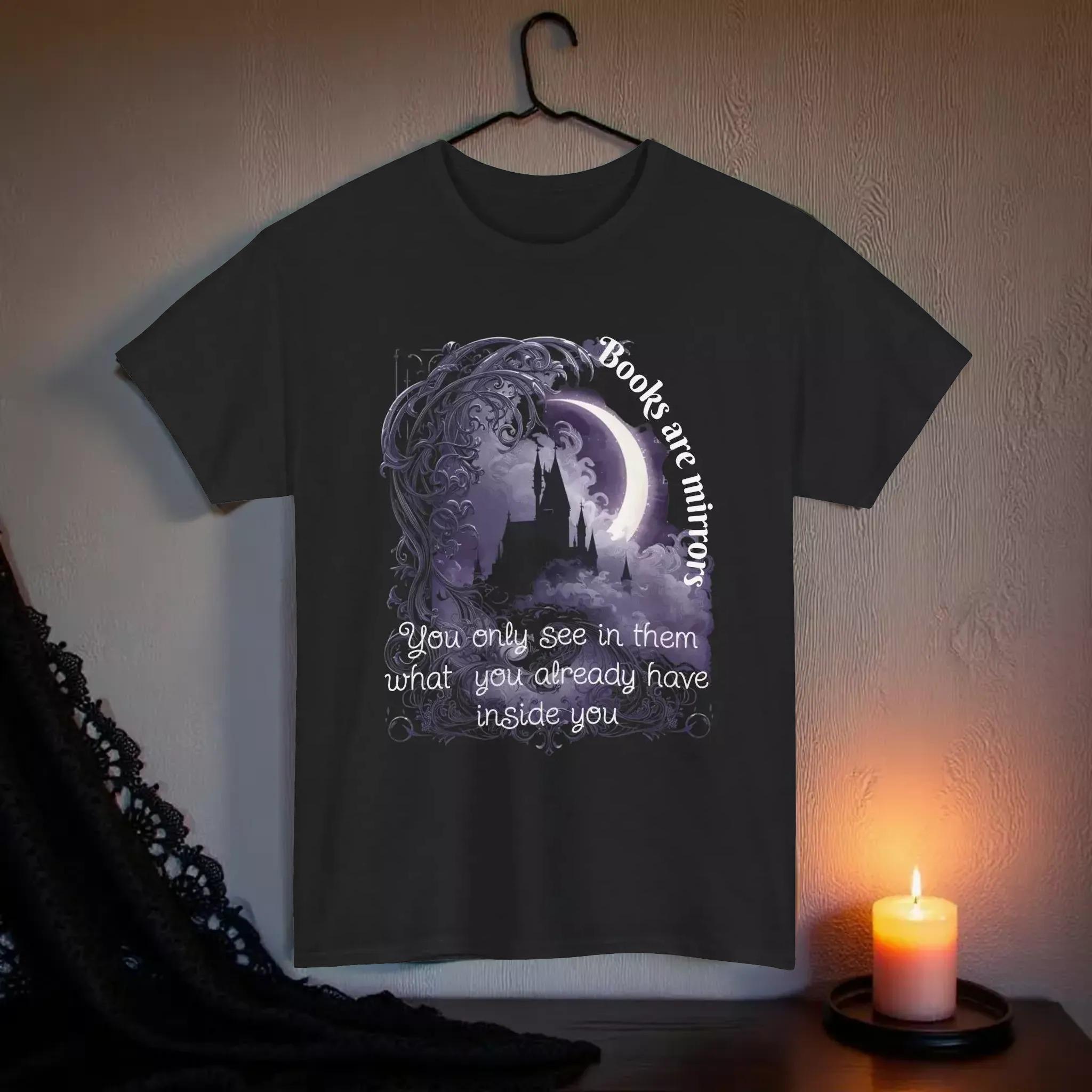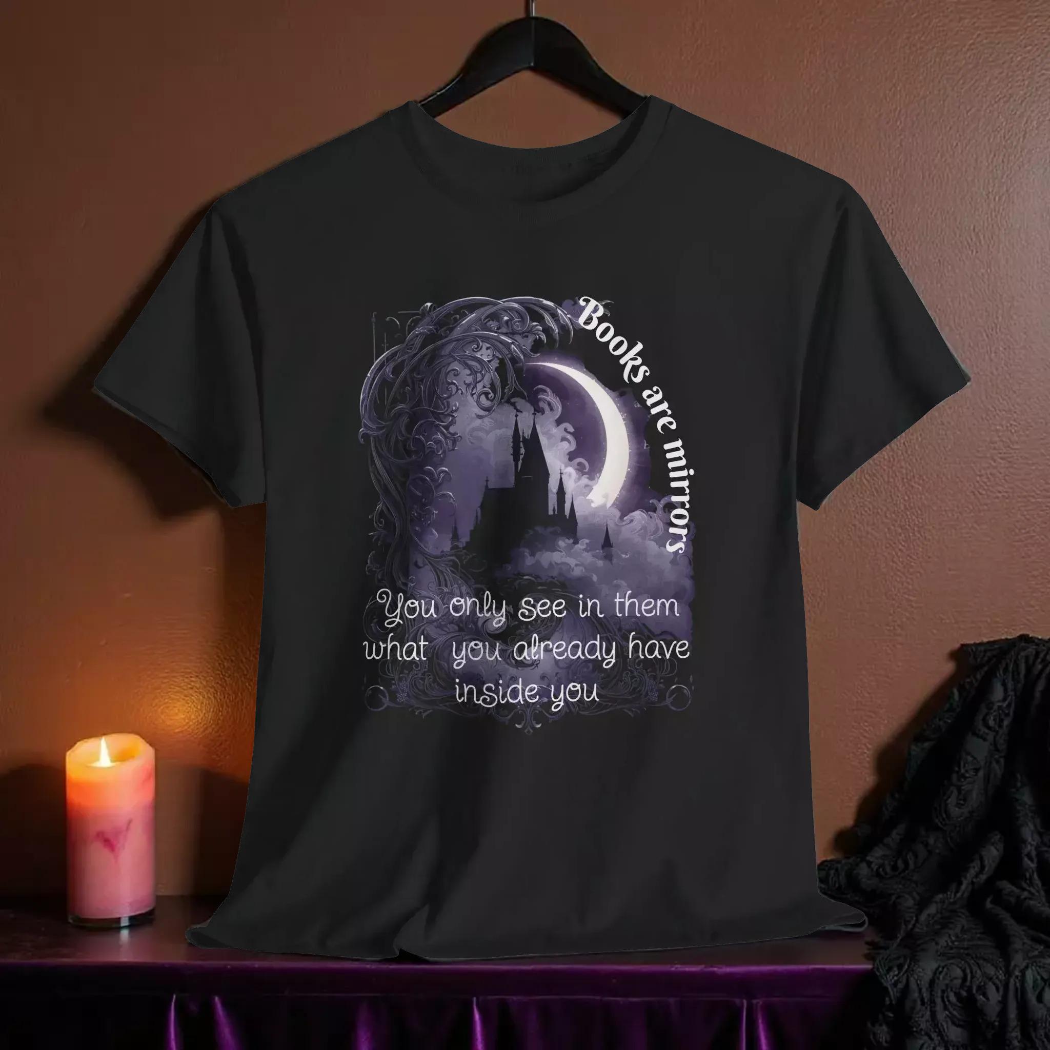 Step into a twilight-goth fantasy with this Mirror of Spells T-shirt, designed for book lovers who cherish the magic of stories. Inspired by the idea that books act as mirrors reflecting our inner worlds, this tee features a crescent moon, swirling mist, and a shadowed castle that evoke cozy-cottage imaginations and quiet introspection. Perfect for readers and nightwalkers alike, it’s a wearable spell that connects you to fellow bookish souls.