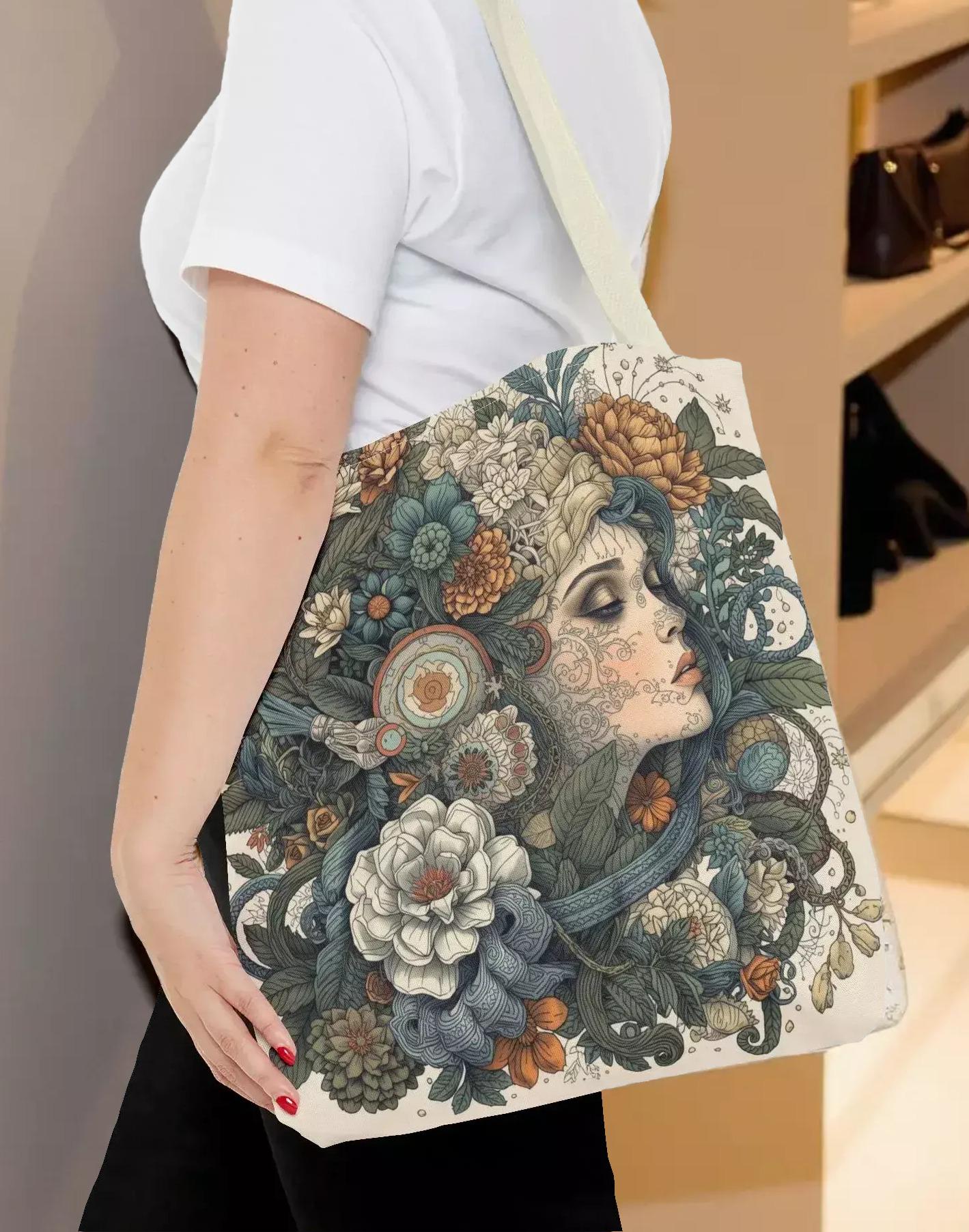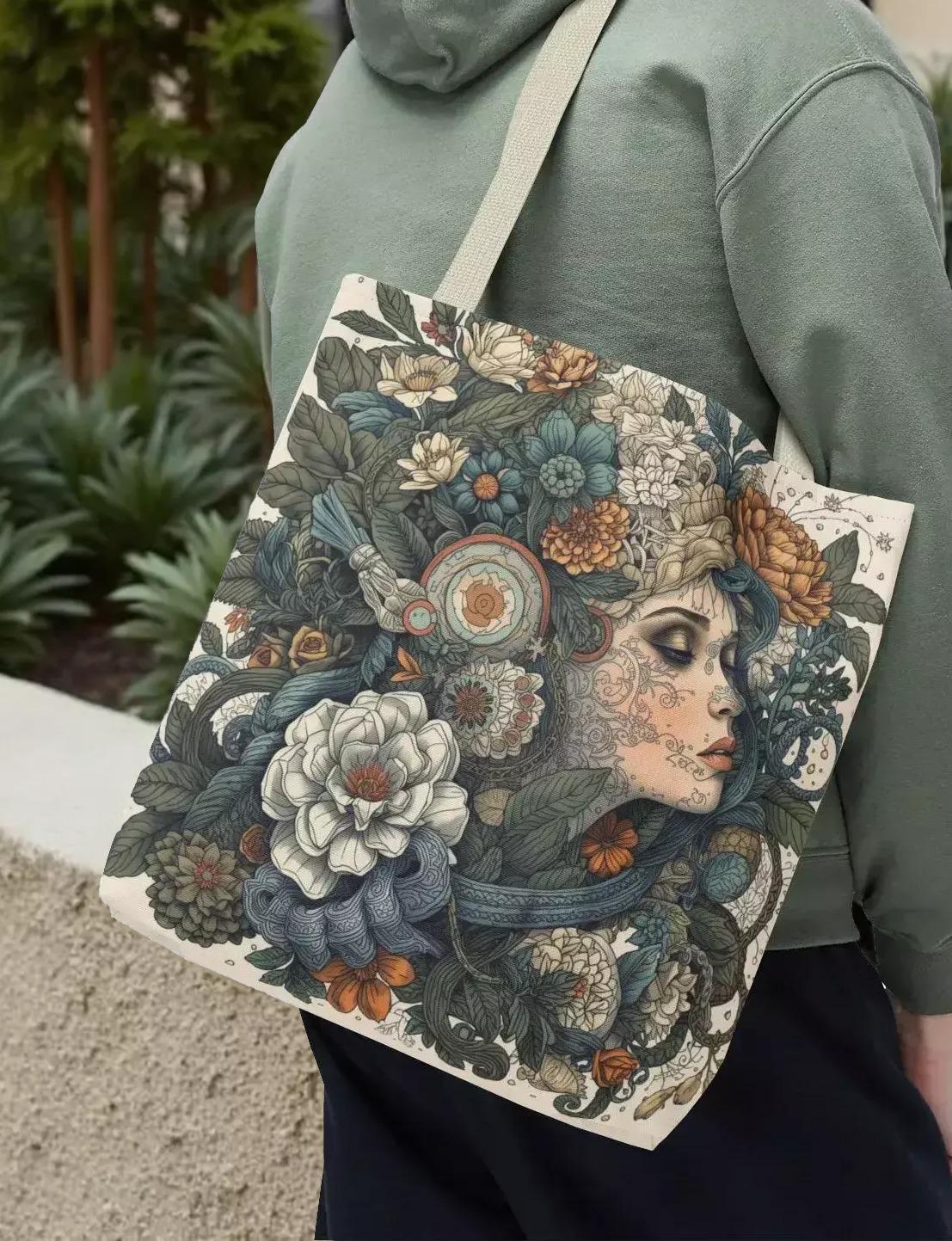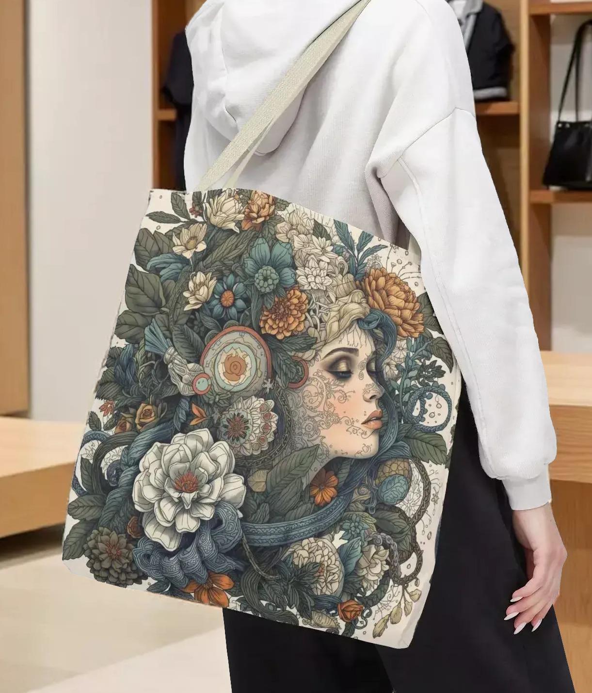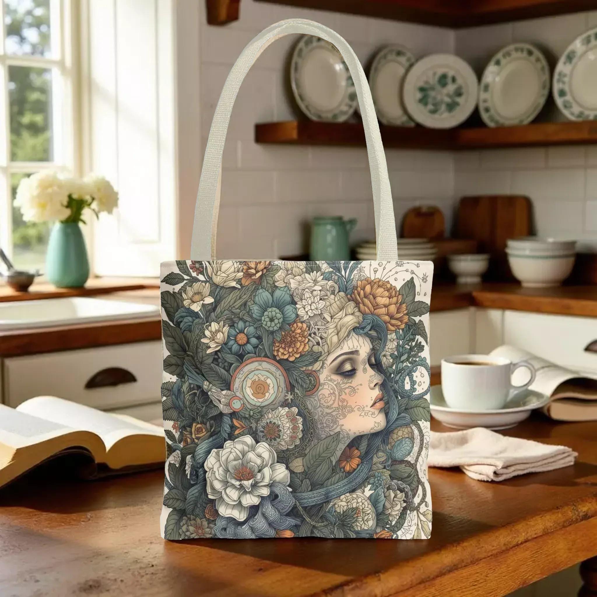 Discover the perfect blend of vintage charm and modern utility with this floral muse art tote bag, designed to elevate your everyday style. Inspired by boho aesthetics and featuring a beautifully illustrated woman woven into delicate blossoms, this tote effortlessly combines artistry with practicality. Whether you're headed to the market, studio, or daily errands, this bohemian-inspired tote offers both elegance and durability.
