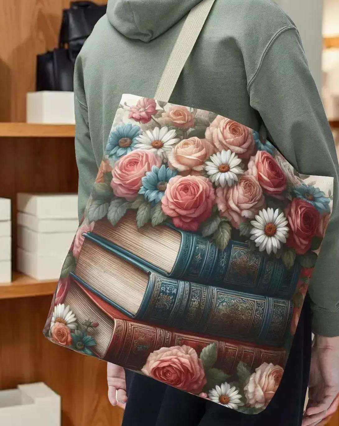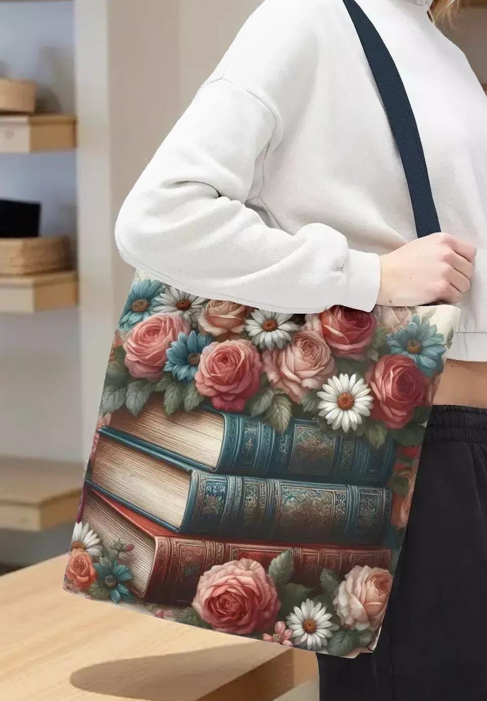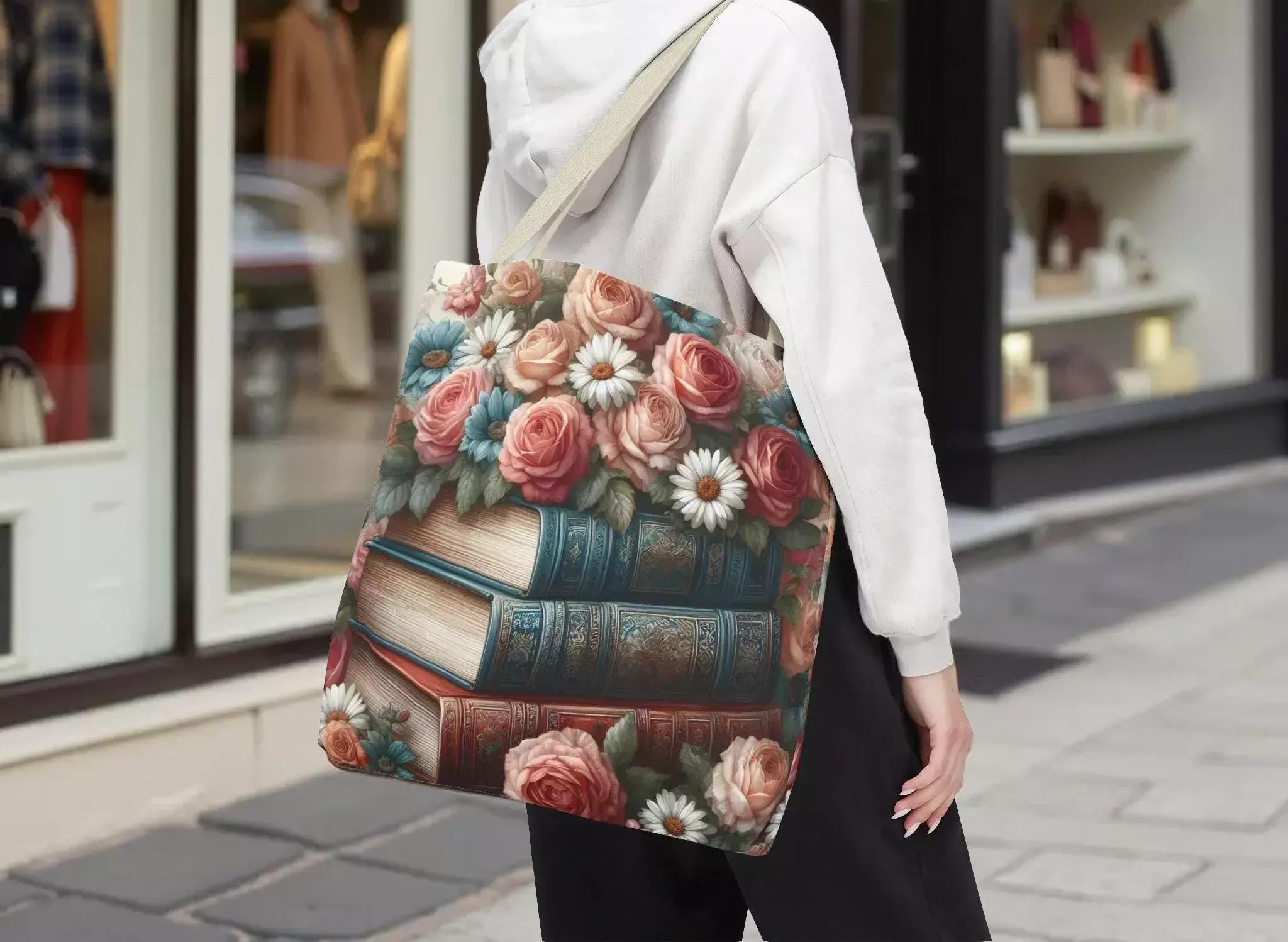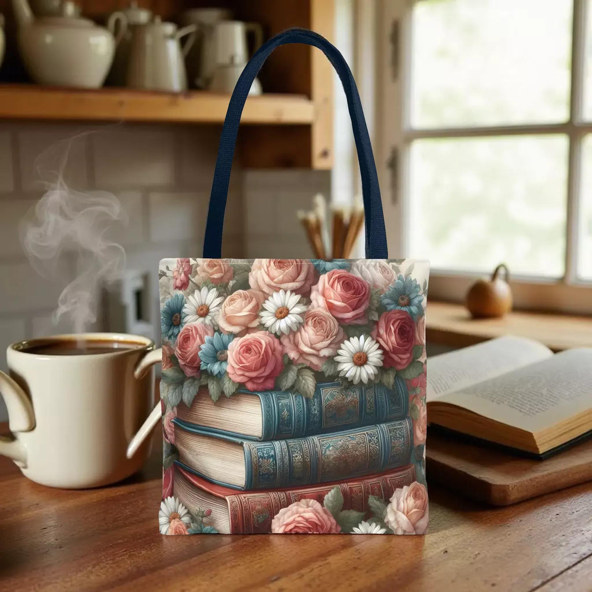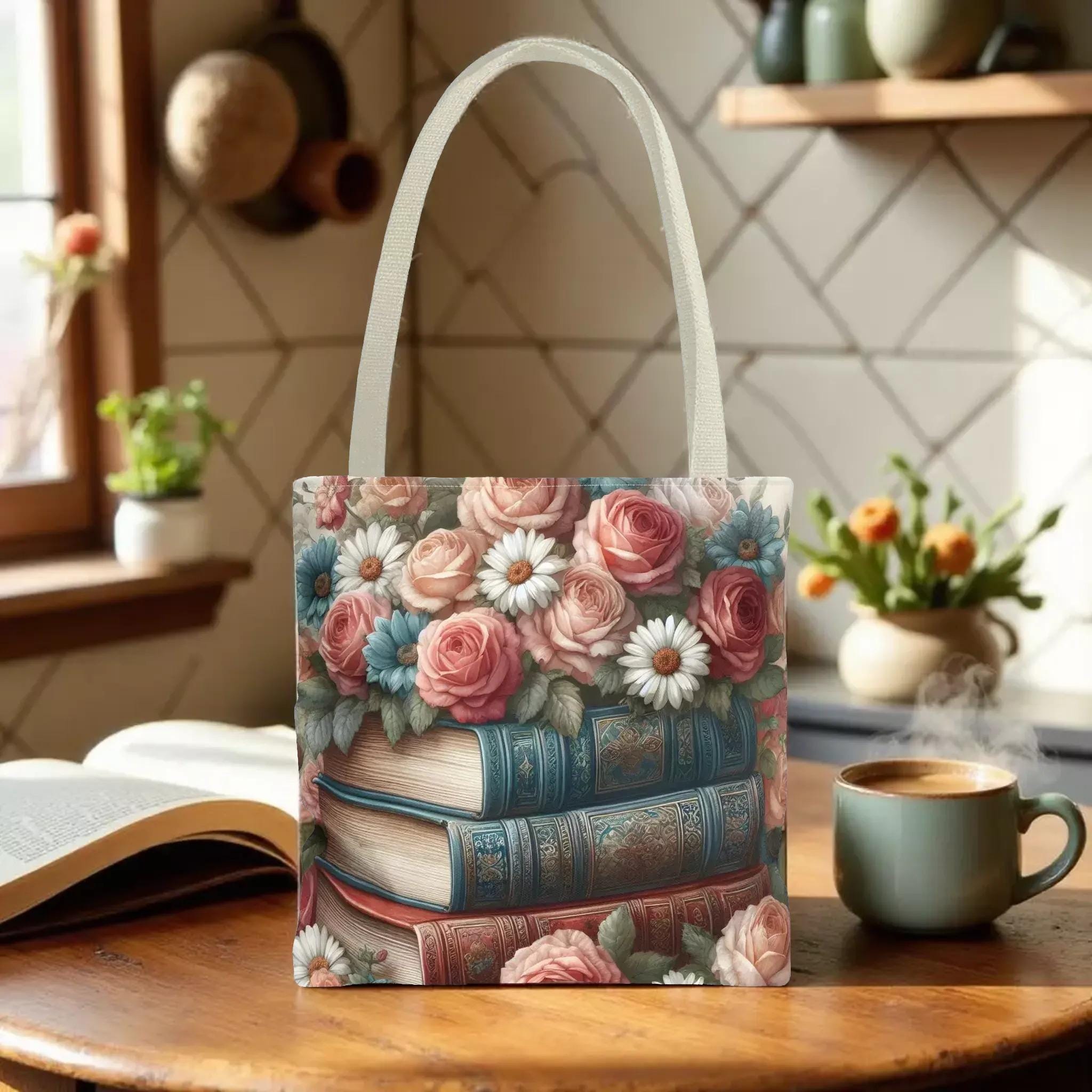 Step into a world where vintage charm meets everyday practicality with this floral vintage look tote bag. Inspired by the gentle beauty of roses and daisies intertwined with stacked books, this carryall is perfect for lovers of nostalgic details and thoughtful design. Whether you're heading to the market, bookstore, or a quiet picnic, this tote blends style and function effortlessly.