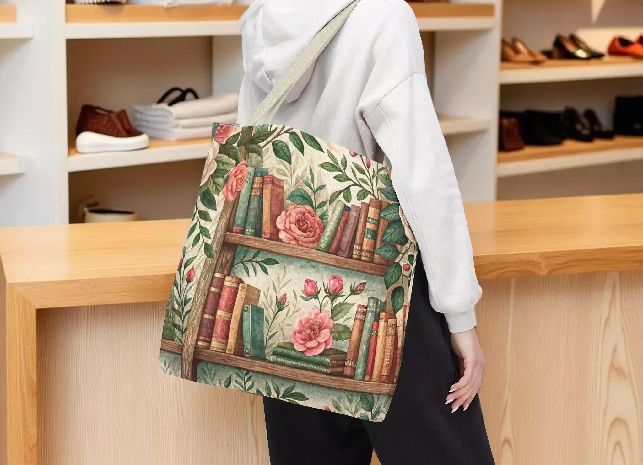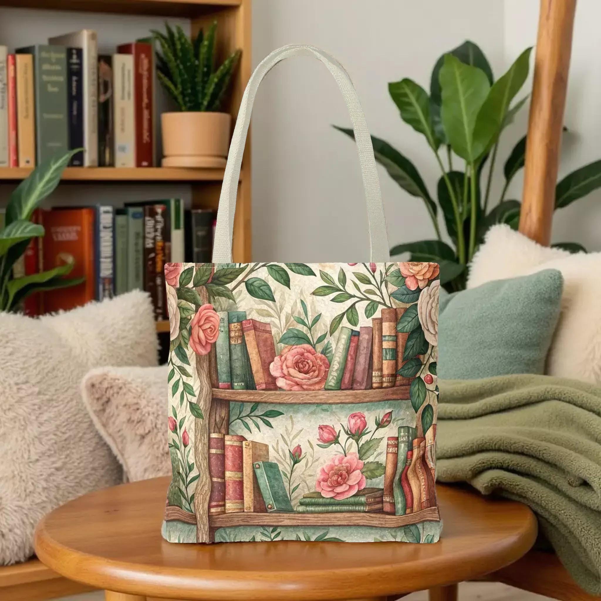 Discover the perfect blend of style and practicality with our floral bookshelf tote bag, designed for book lovers and shoppers alike. Crafted with durable polyester and featuring vibrant all-over prints, this carryall stands out with its charming floral design and sturdy construction. Whether you're heading to the market or carrying your favorite reads, this tote bag offers both elegance and functionality with multiple handle color options to suit your style.