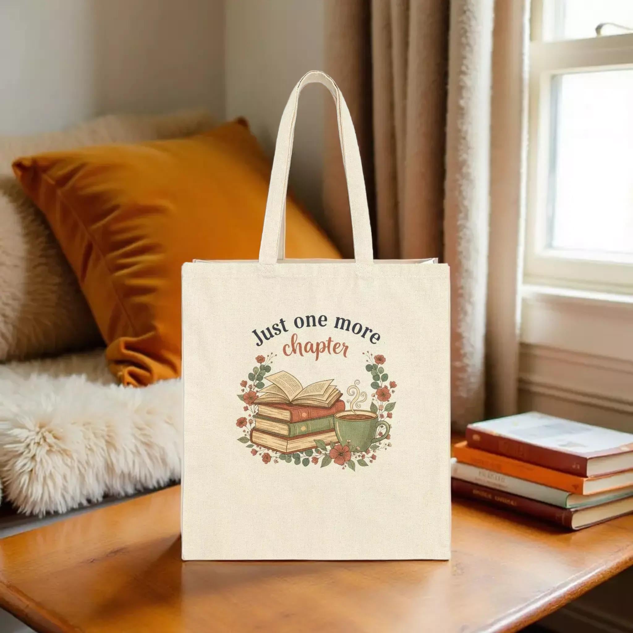 For book lovers who cherish every page, this canvas tote is designed to carry your favorite novels and essentials with ease. Crafted from durable cotton canvas, it features a charming "just one more chapter" design surrounded by delicate floral accents, perfect for cozy coffee shop afternoons or weekend book swaps. The personalized name option on the back adds a subtle, handcrafted touch that makes this tote uniquely yours.