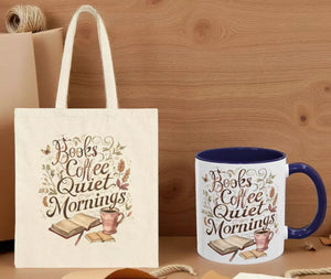 Books, Coffee & Quiet Mornings Tote Bag — Personalized Cotton Canvas Book Lover Gift Set Incudes Mug