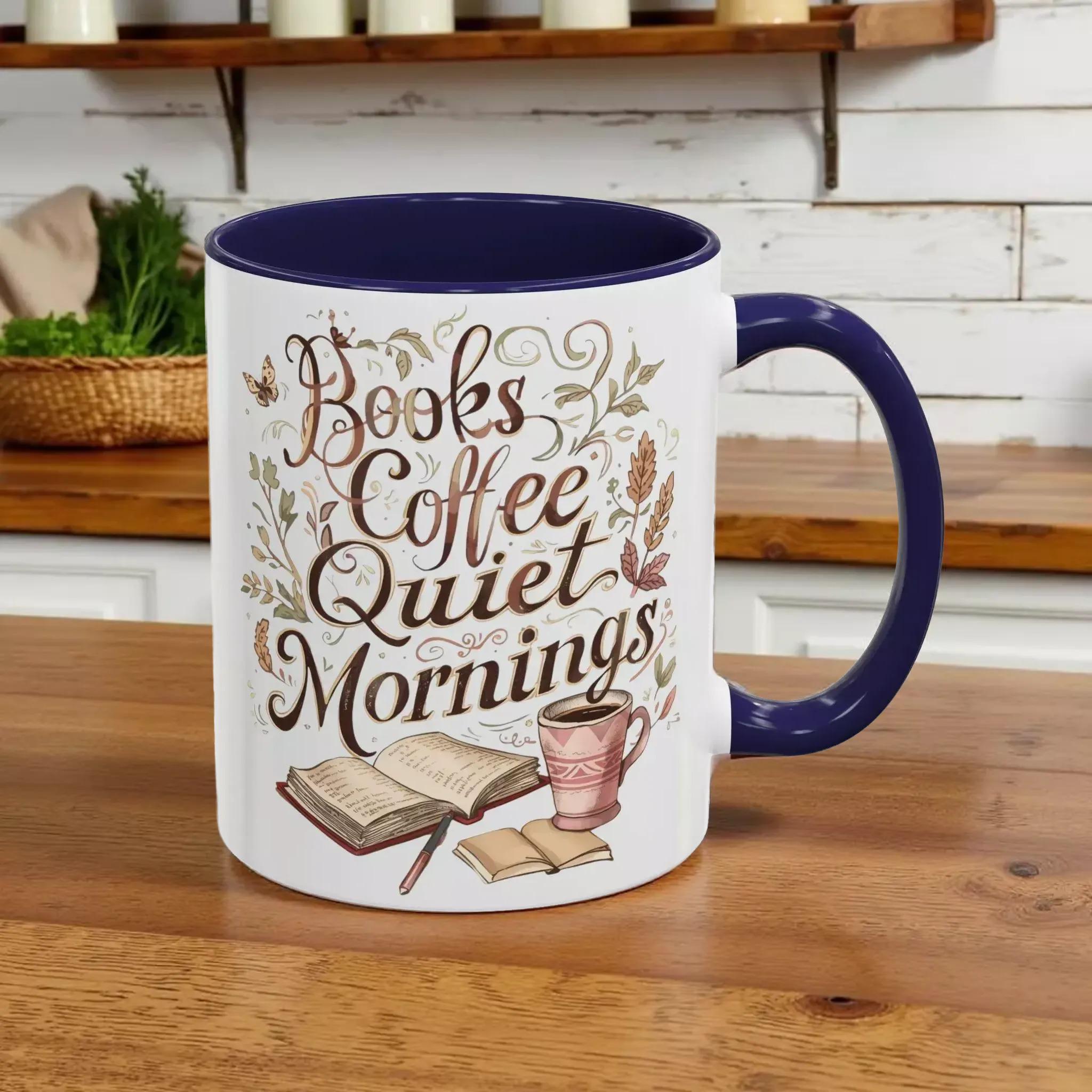 - Front features a warm hand-lettered design "Books Coffee Quiet Mornings" with autumnal flourishes