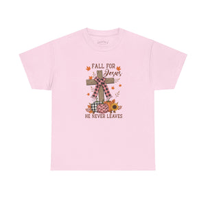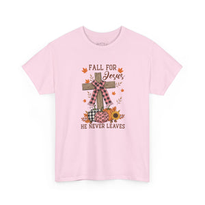 Embrace comfort and style with this Heavy Cotton Tee, perfect for expressing faith and style with a delightful autumn touch. Featuring a charming design that reads, 'Fall for Jesus, He Never Leaves,' this tee radiates warmth and positivity, making it an ideal choice for casual gatherings, church events, or cozy fall outings. Made from soft, durable fabric, it provides an easy fit for adults of all sizes, ensuring you feel great while sharing your faith. This versatile shirt is a thoughtful gift for friends and family during the fall season, Thanksgiving celebrations, or as a reminder of faith throughout the year.