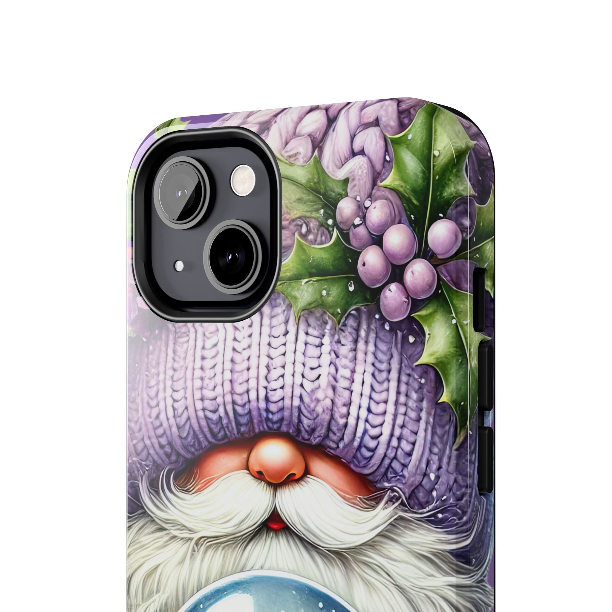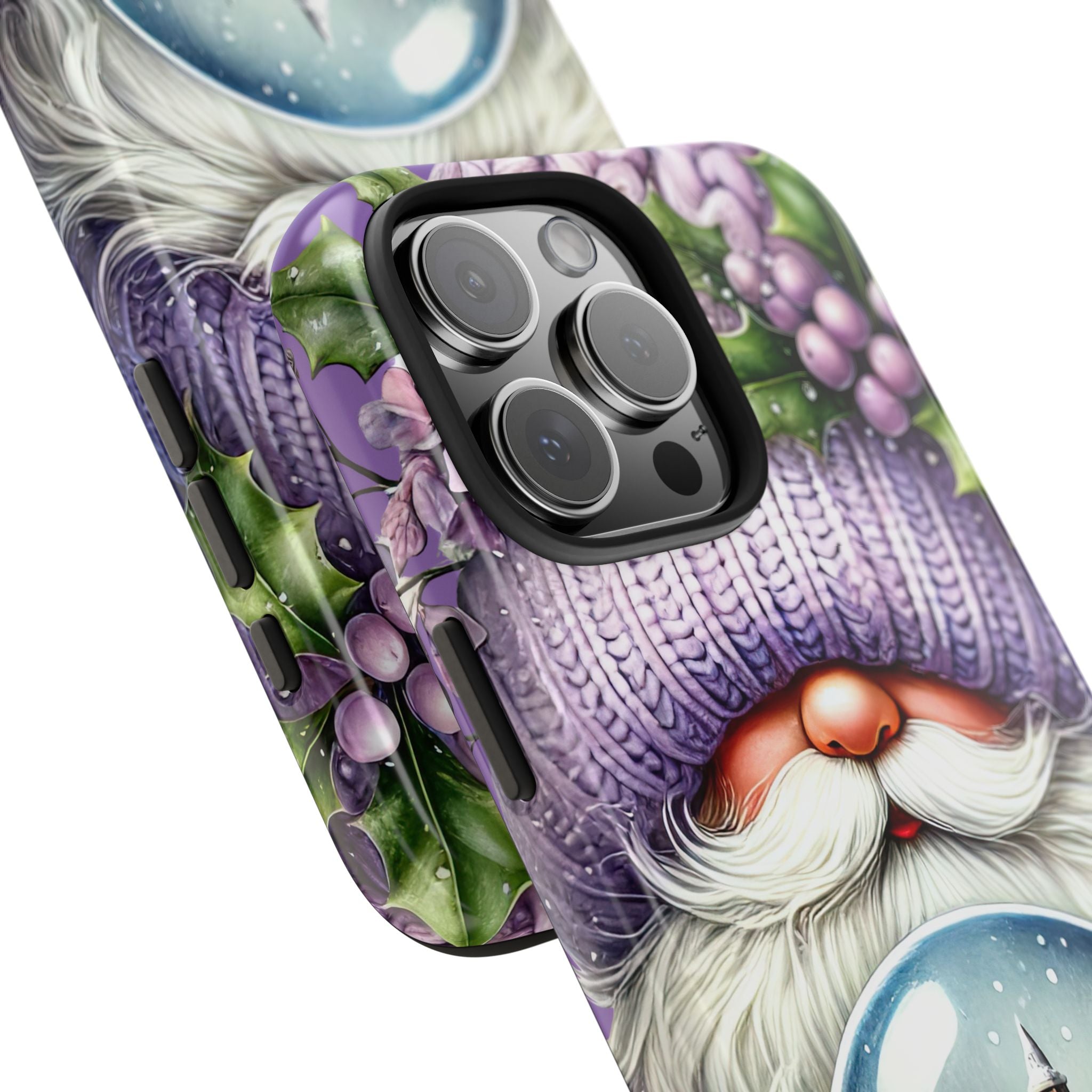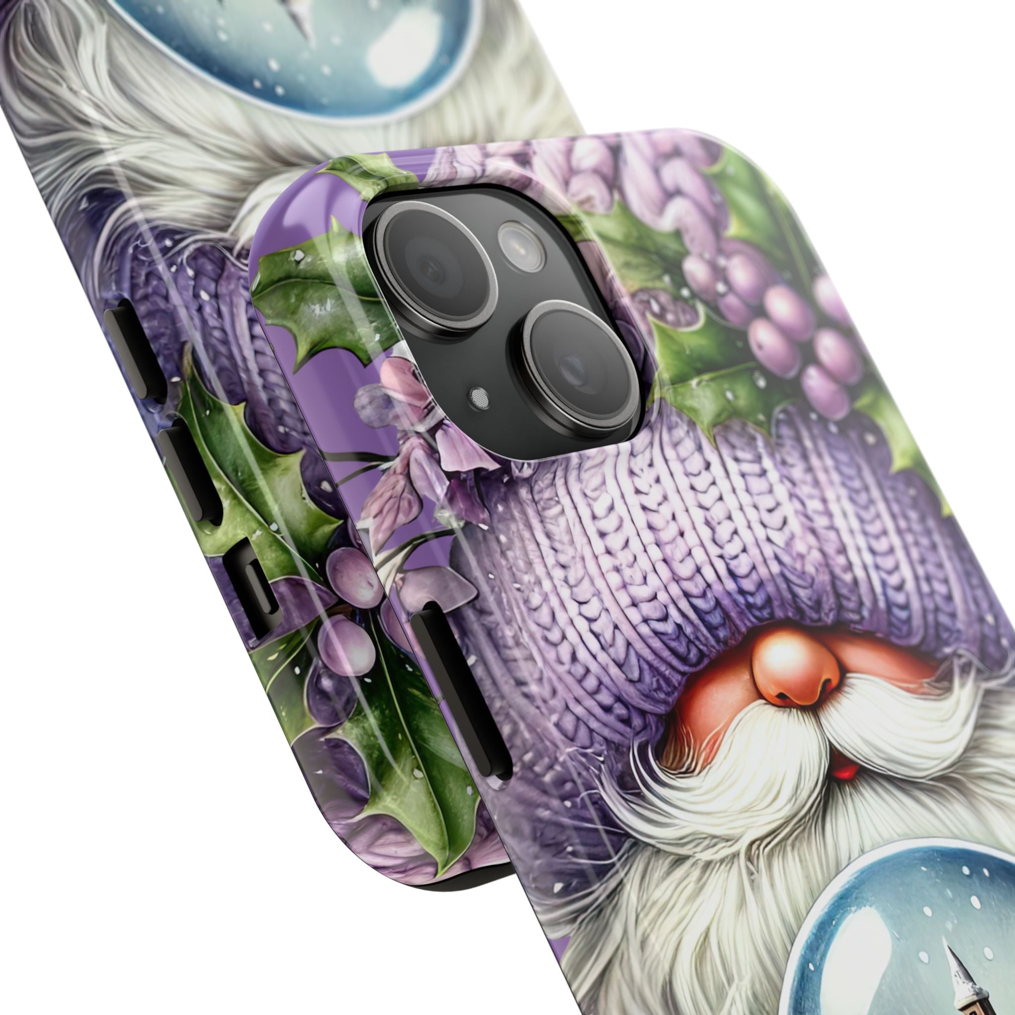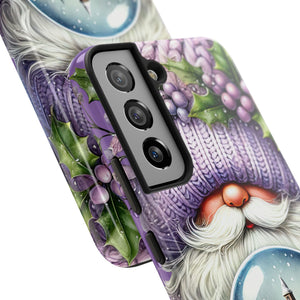 Protective and festive tough phone case featuring a Christmas Gnome in purple colors inside a snow globe design. Perfect for the holiday season, this durable case offers impact resistance and shock dispersion. Ideal for adults looking for a stylish and protective accessory for their phone.