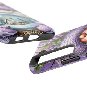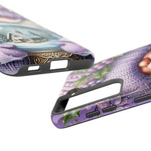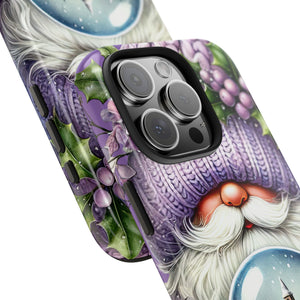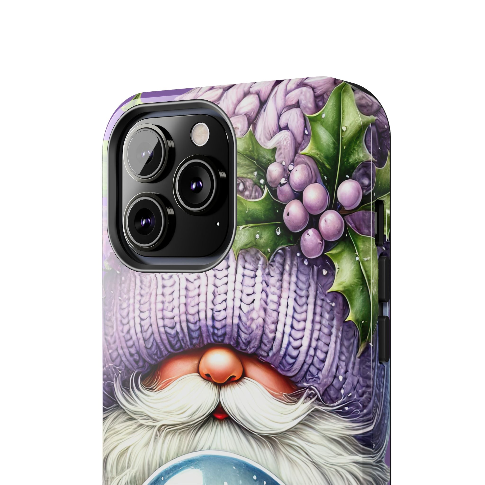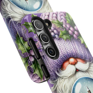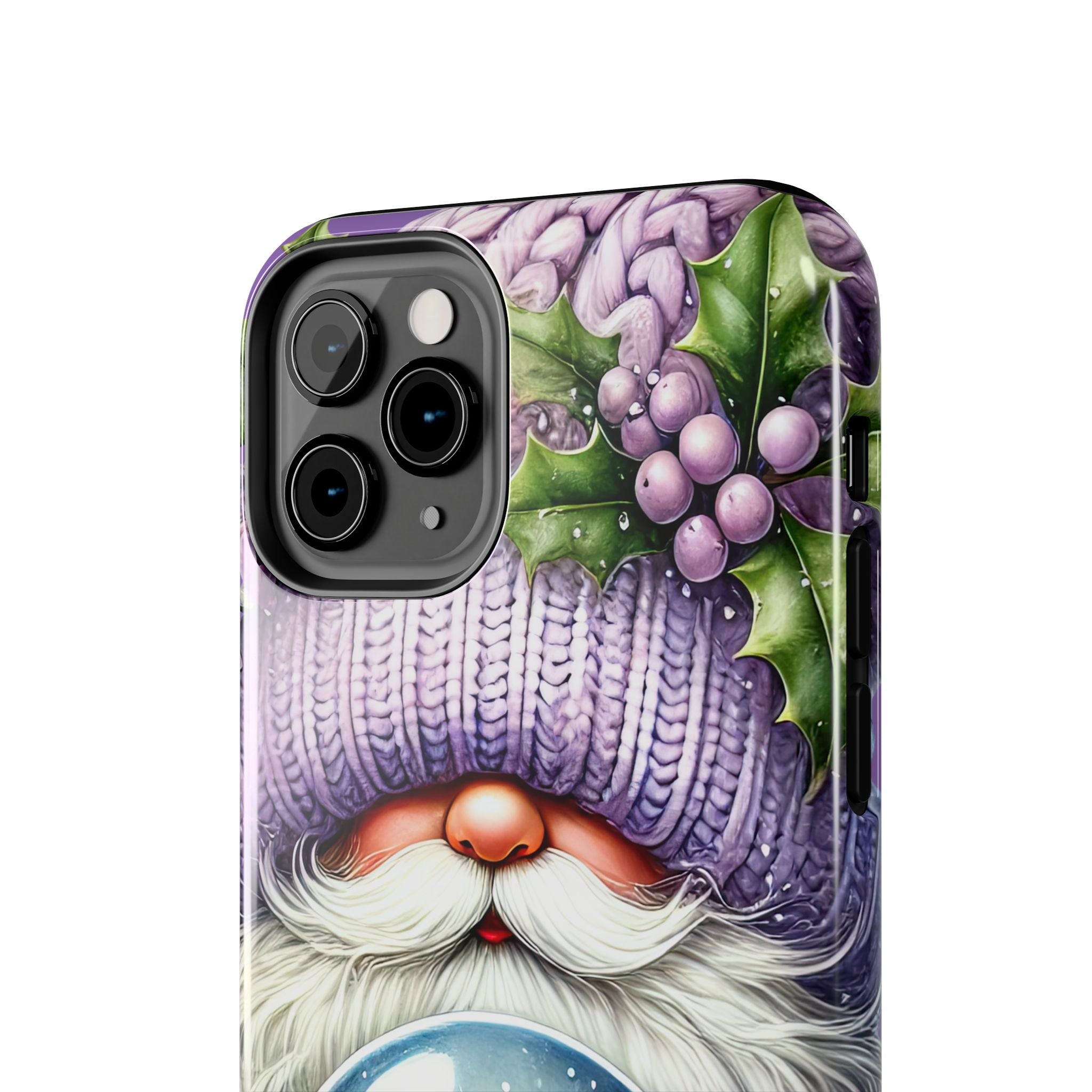 Protective and festive tough phone case featuring a Christmas Gnome in purple colors inside a snow globe design. Perfect for the holiday season, this durable case offers impact resistance and shock dispersion. Ideal for adults looking for a stylish and protective accessory for their phone.