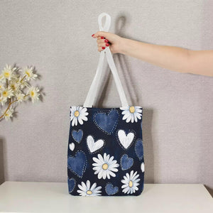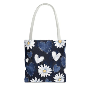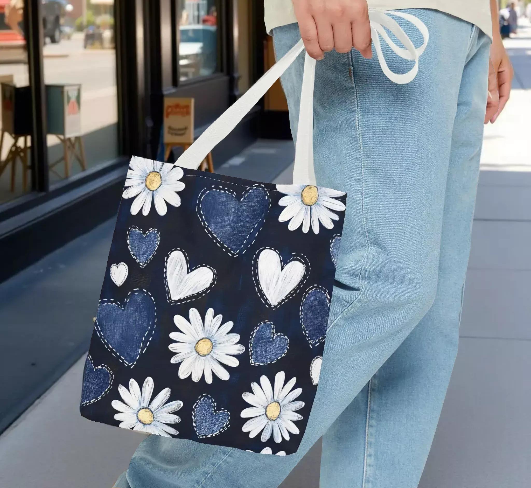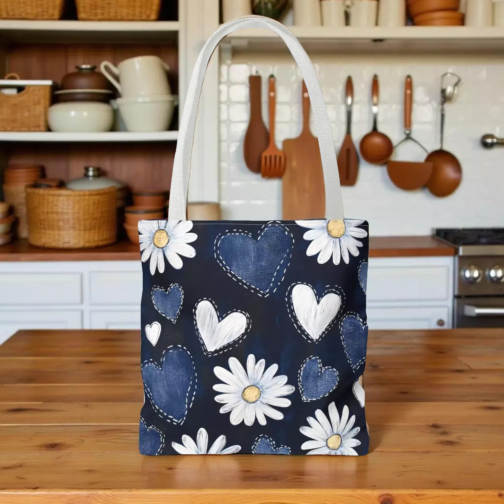 Discover the charm of this navy blue tote bag, thoughtfully designed with delicate daisies and denim hearts that evoke a cozy, homespun feel. Crafted for everyday use, this casual carryall book bag blends artful hand-painted vibes with practical durability. Whether you're heading to the market or carrying creative supplies, this tote makes a joyful statement with its unique pattern and sturdy construction.